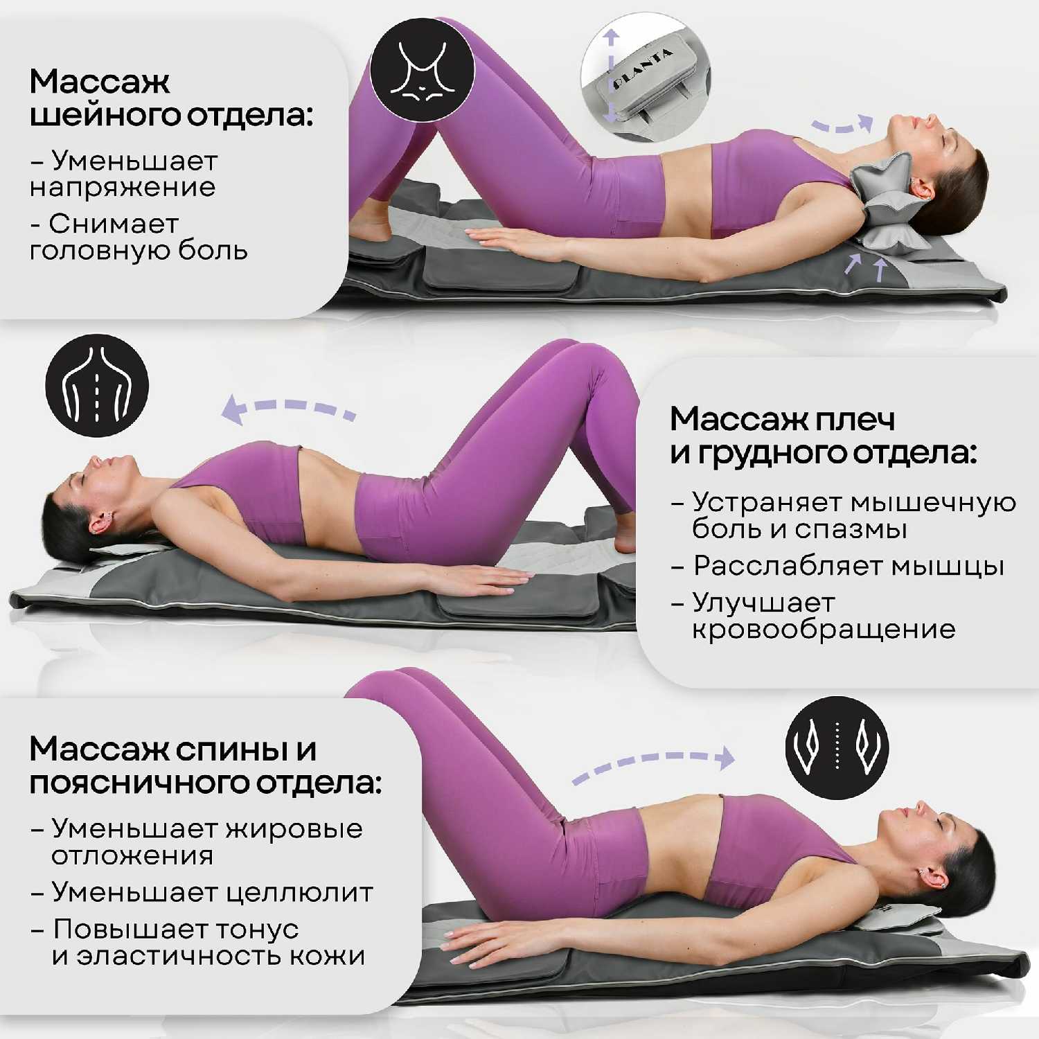 | Зона массажа : | бедра, ноги, поясница, руки, спина, стопы, шея, ягодицы |