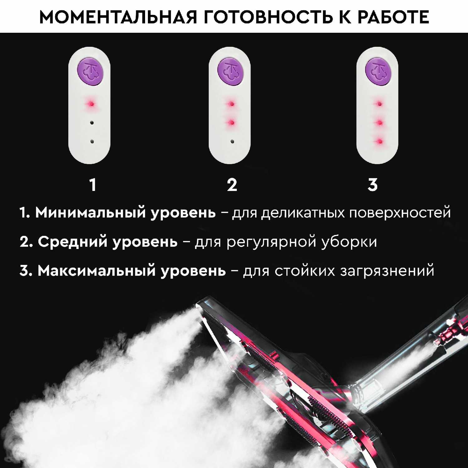 - Технический параметр: три уровня подачи пара (регулируемая мощность) обеспечивают адаптацию к разным загрязнениям.