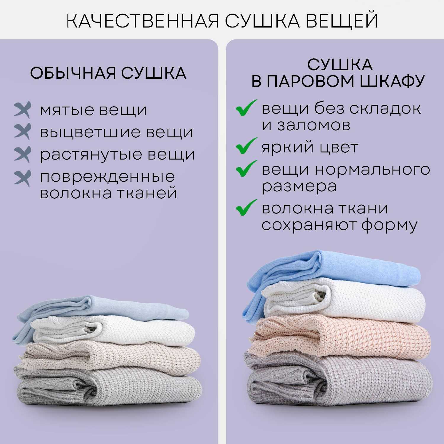 Отличный вариант кто не любит гладить и отпаривать. Шкаф не только сушит, но и отпаривает вещи. После сушки вещи становятсч мягче чем просто сушка на батарее. Толстые полотенца высыхают за 1,5 часа. Футболки же оченб быстро. В комплекте есть грузики магниты которые оттягивают вещи вниз благодаря чему отпариваются еще лучше .
