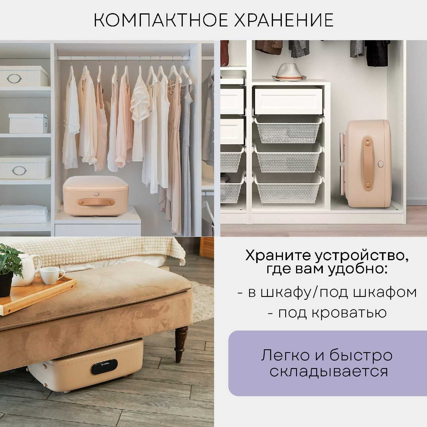 С таким прибором стало очень просто мне, как хозяйке. Качество шкафа потрясающее! В нём всё продумано. Очень нравится, что не надо следить за временем, устройство само отключается по завершению. Вещи проглаживает, отпаривает, дезинфицирует убирая неприятные запахи! Особенно удобно с детскими вещами и игрушками. Обеззараживаю и обувь, все запахи уходят. Не представляю, как раньше жила без него!