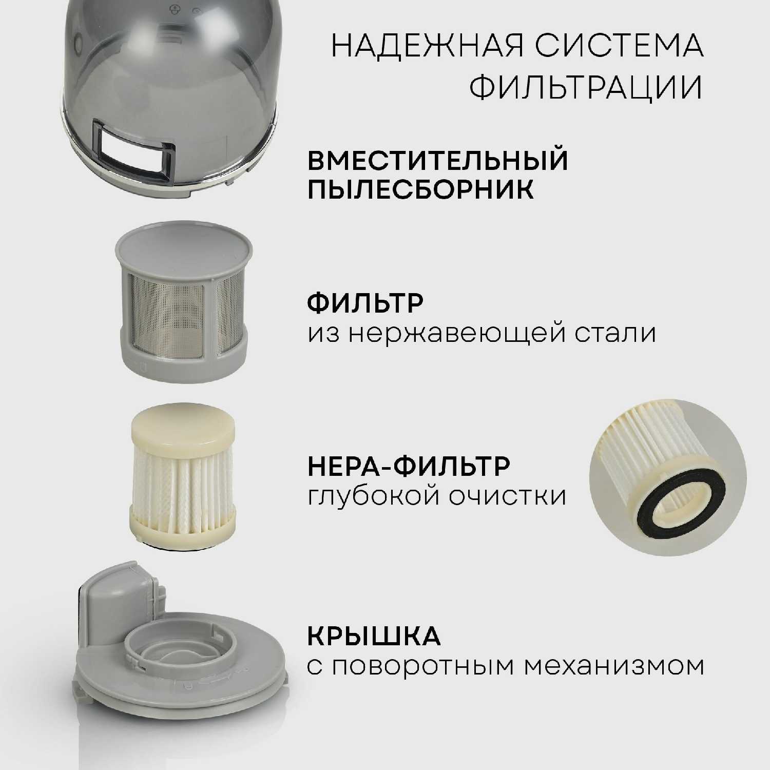 Съемный НЕРА-фильтр задерживает микрочастицы пыли, аллергены и микроорганизмы размером до 0,3 микрона, предотвращая их попадание обратно в воздух. После уборки пользователи отмечают ощутимую свежесть в помещениях и снижение симптомов аллергии у детей. Фильтр легко промывается под проточной водой и быстро высыхает для повторного использования. -