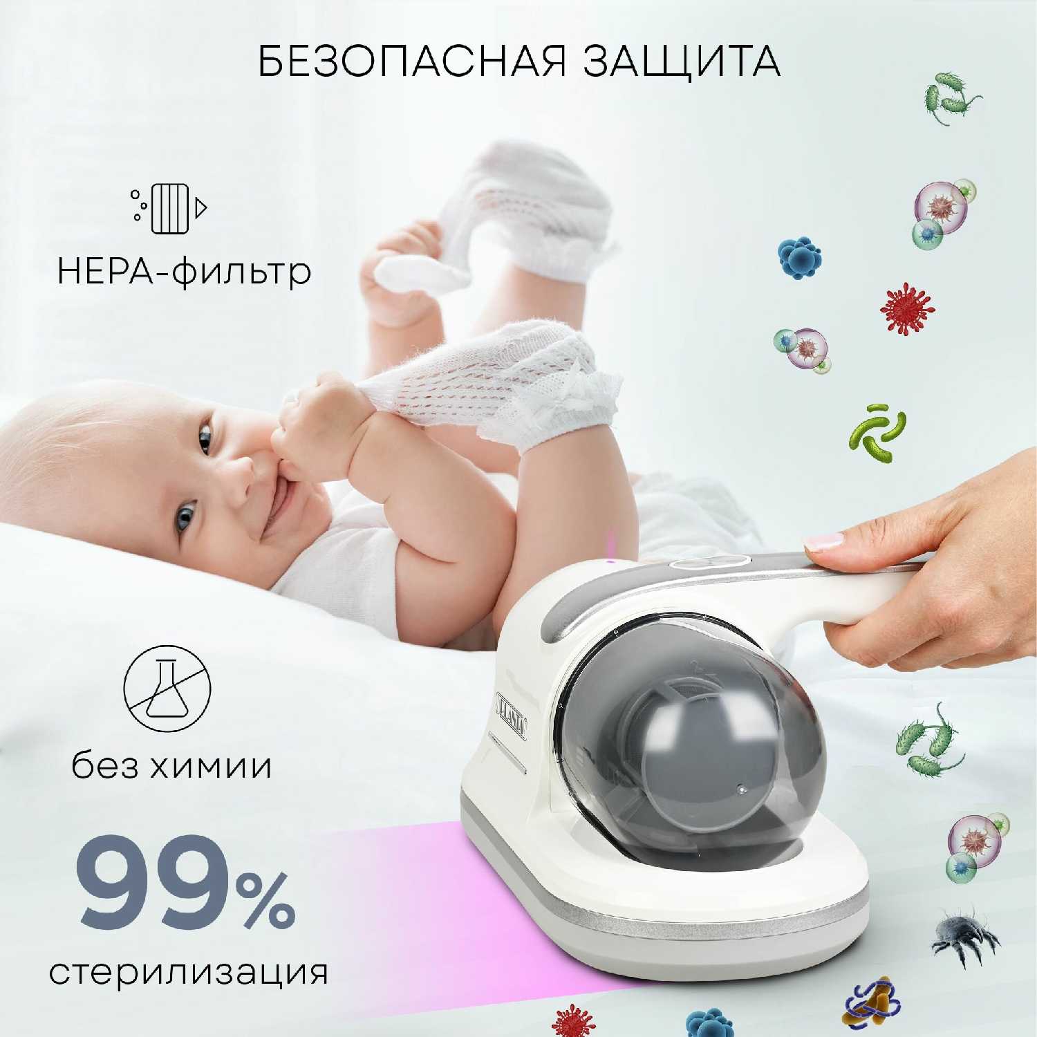 Да, УФ-лампа и парогенератор безопасно обеззараживают мягкие игрушки, коляски, матрасы и постельное белье, уничтожая до 99% бактерий. Родители используют его для обработки поверхностей, с которыми контактируют дети, снижая риски инфекций. Отсутствие химических средств делает метод экологичным и гипоаллергенным. -