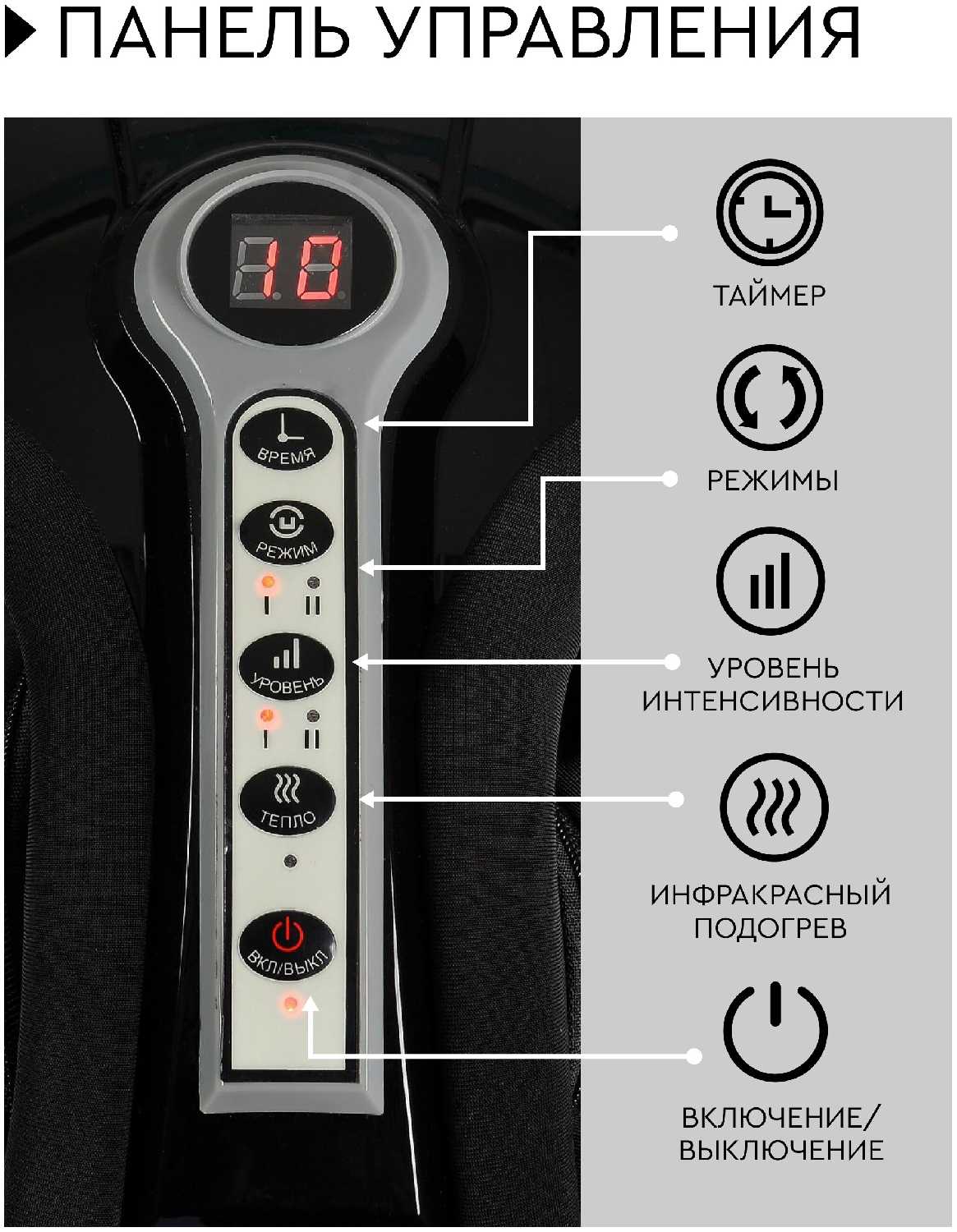- Компрессионные подушки с регулируемой интенсивностью обеспечивают глубокое давление, улучшая кровообращение.