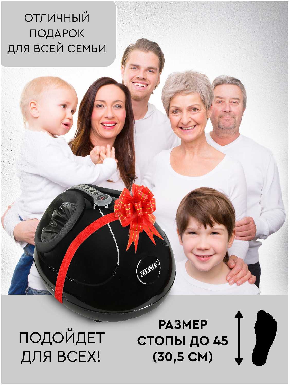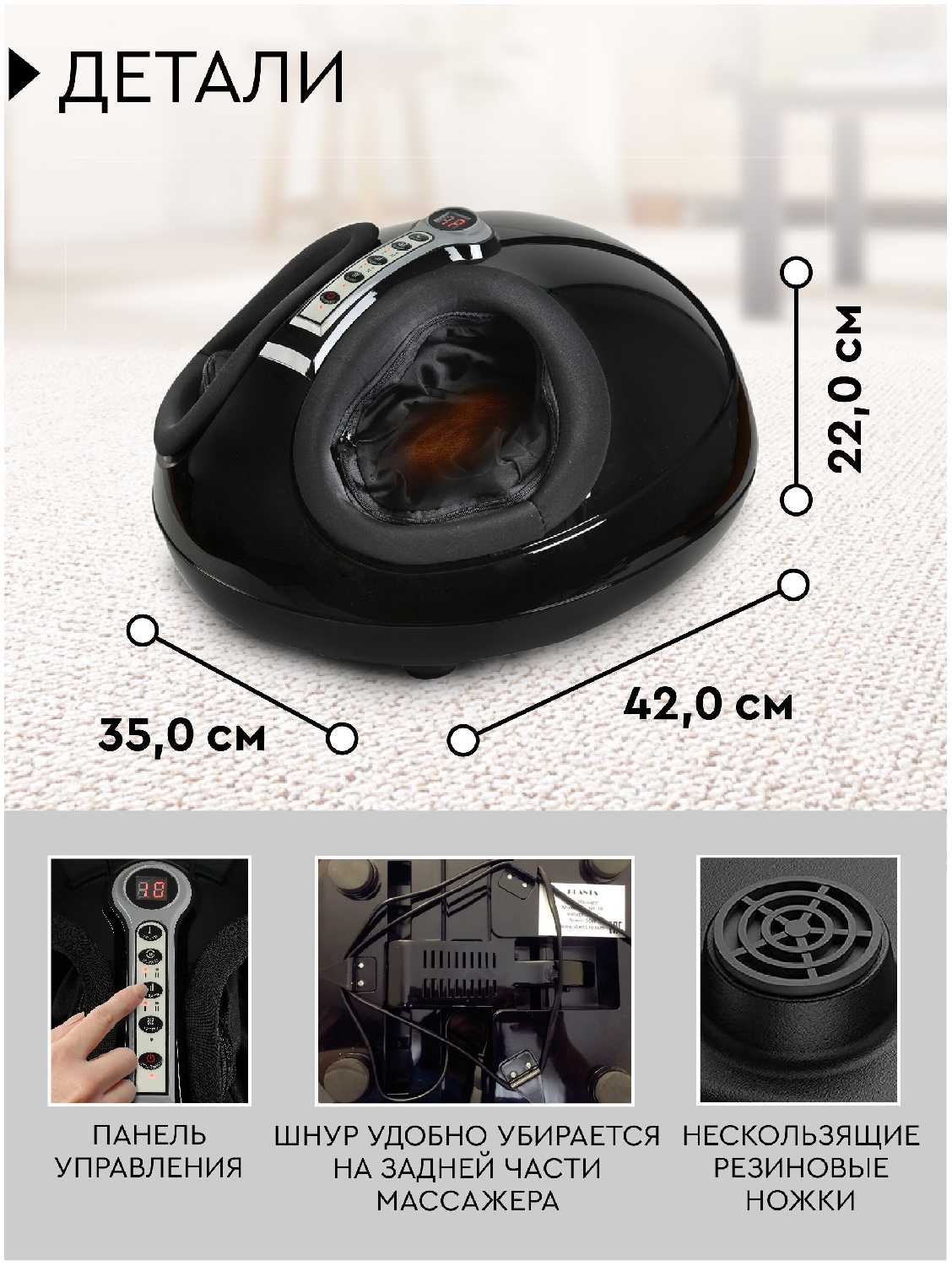 Обтекаемый корпус в форме «капсулы» выглядит современно и компактно, что позволяет разместить устройство даже в небольших помещениях. Чехлы на молнии легко снимаются для стирки, а панель управления интуитивно понятна даже пожилым. Однако короткий шнур (менее 1.5 м) ограничивает мобильность. Пользователи отмечают, что массажёр можно использовать даже во время работы за компьютером, переключая режимы ногой. Для поездок на дачу или в командировки устройство удобно, но отсутствие чехла в комплекте осложняет транспортировку. Черный цвет визуально уменьшает габариты, но требует частой протирки от пыли.