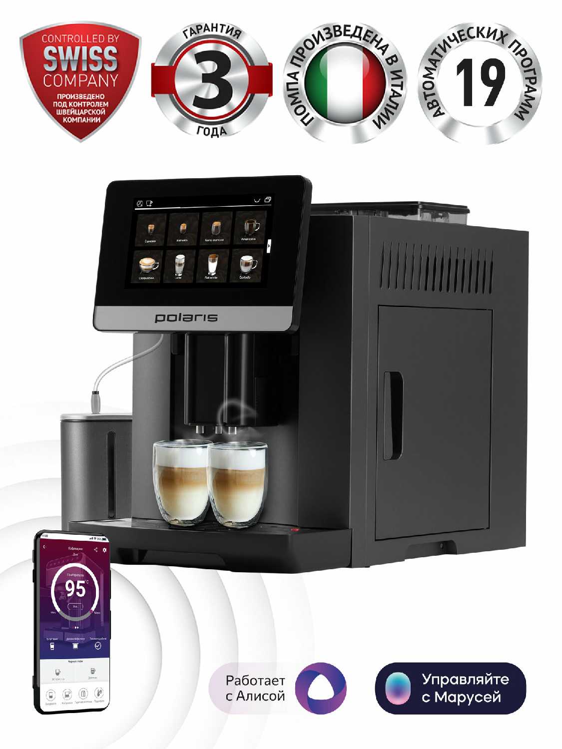 - Интеграция с Алисой для запуска напитков, прогрева; работает с iPhone, Android.