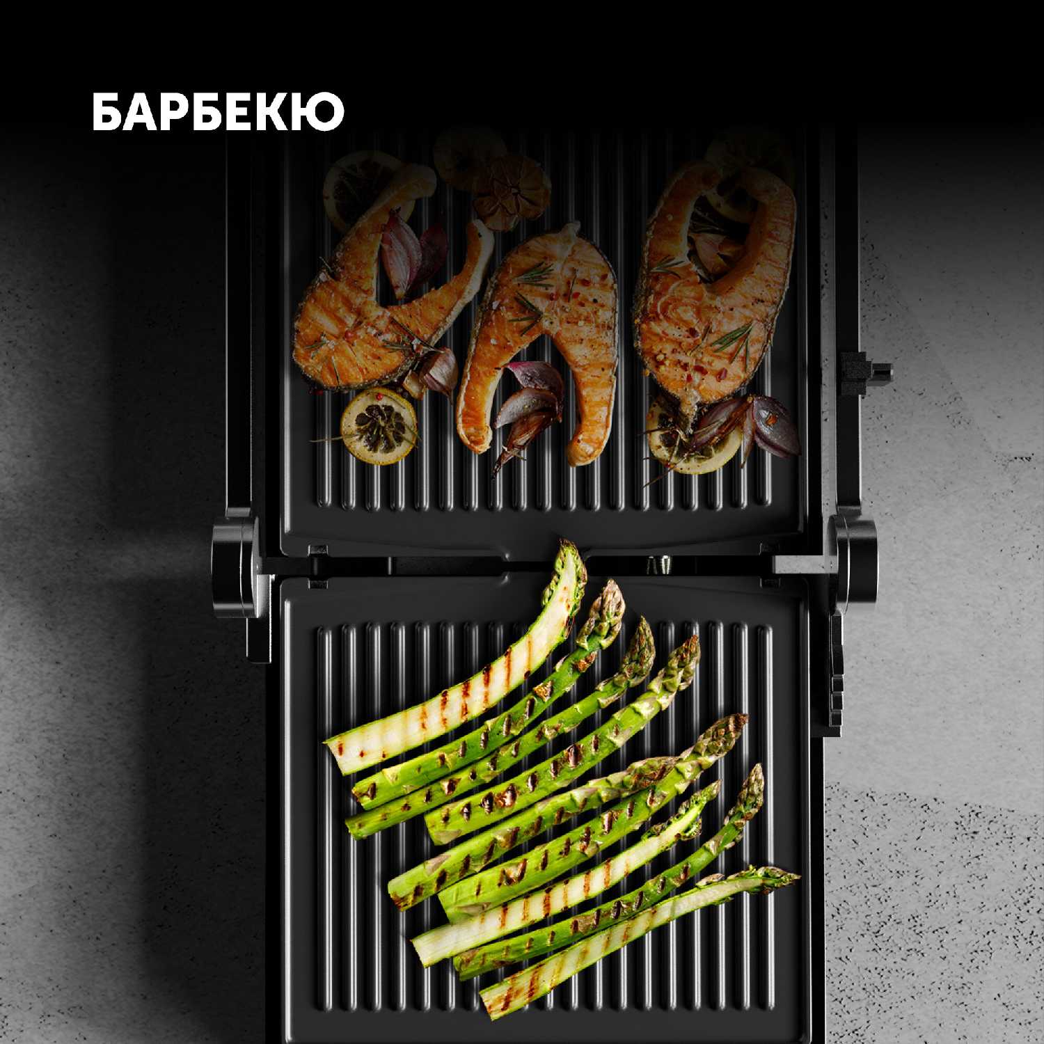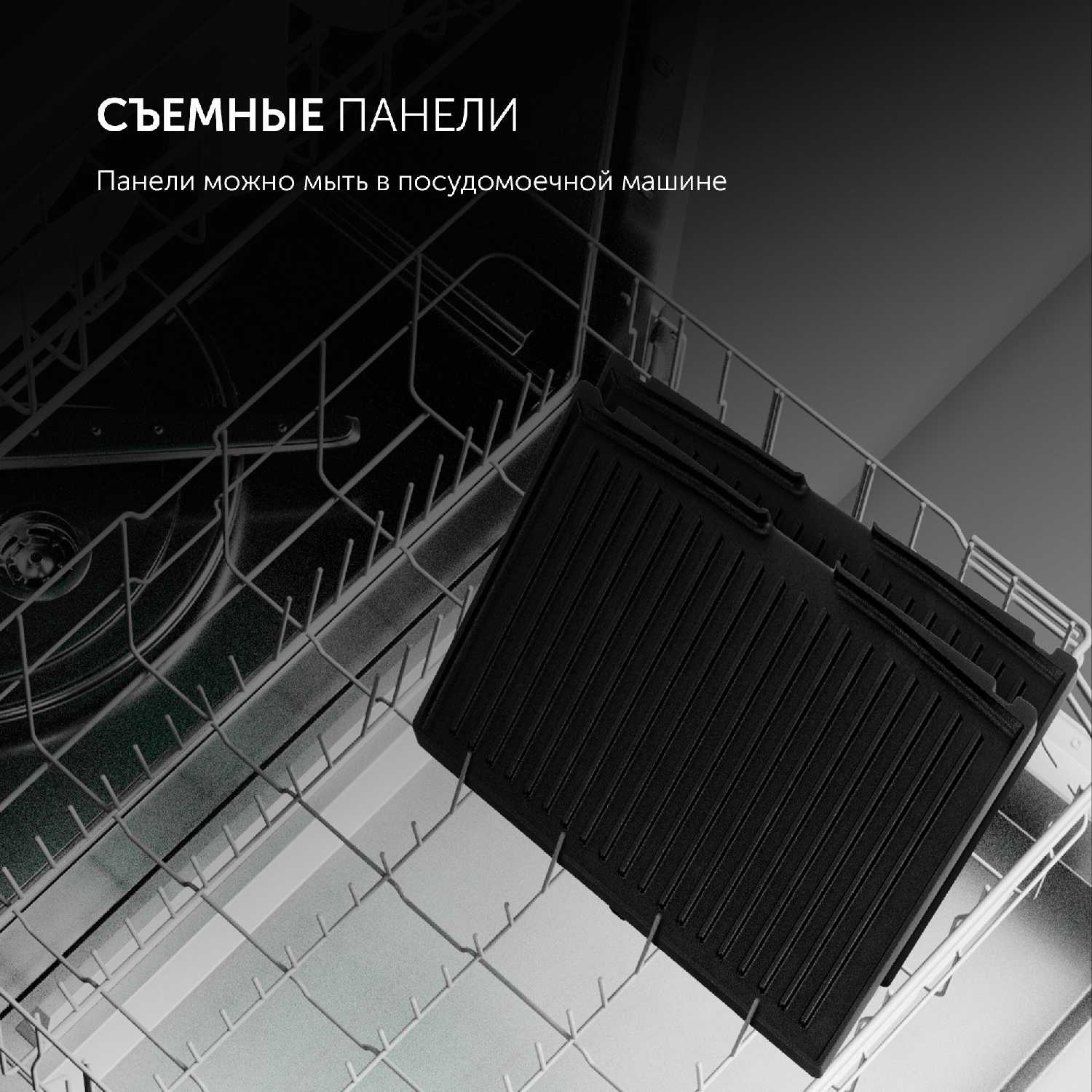 - Плотное прилегание панелей равномерно обжаривает продукты, делая стейки и овощи вкусными без сухости или подгорания.