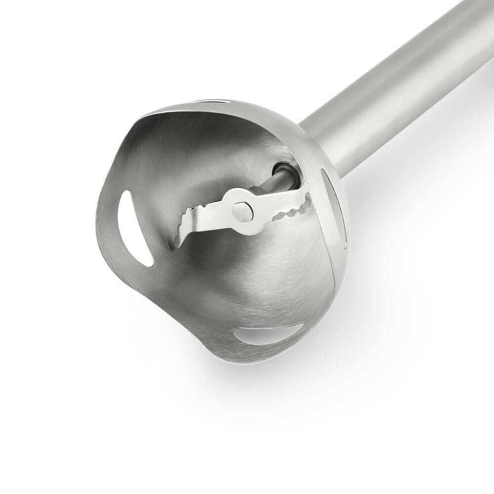 Металлический зонтик с отверстиями создает вихревой поток, который дополнительно измельчает и аэрирует массу. Это особенно полезно для супов-пюре и соусов, делая их текстуру более нежной. Ребристая поверхность ножей предотвращает налипание продуктов, а матовое покрытие снижает риск появления царапин.