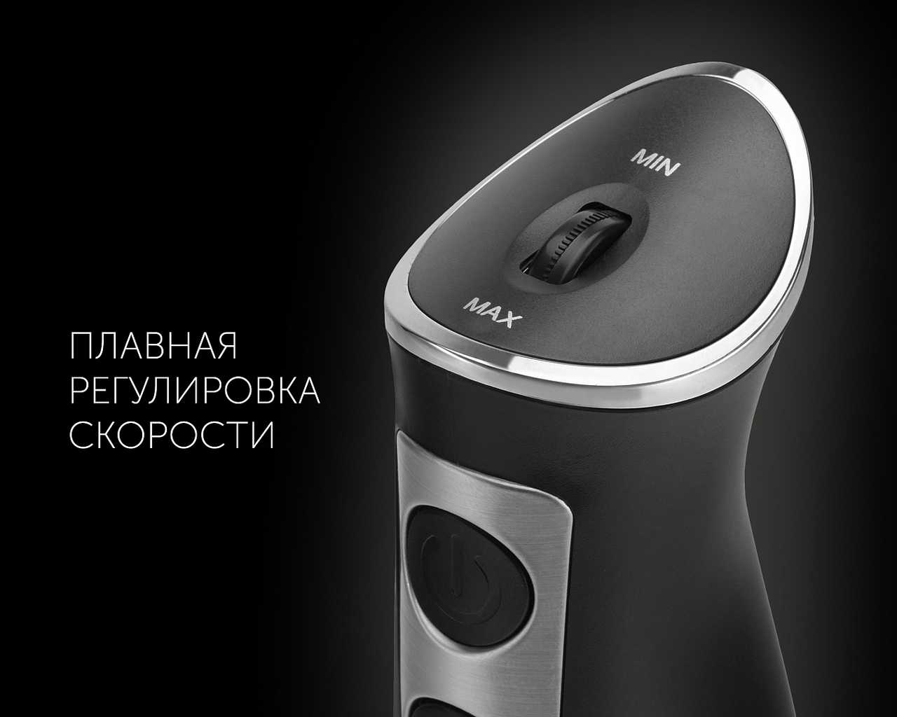 - Колесико для регулировки скорости позволяет точно настраивать обороты, избегая разбрызгивания при работе с жидкими смесями.