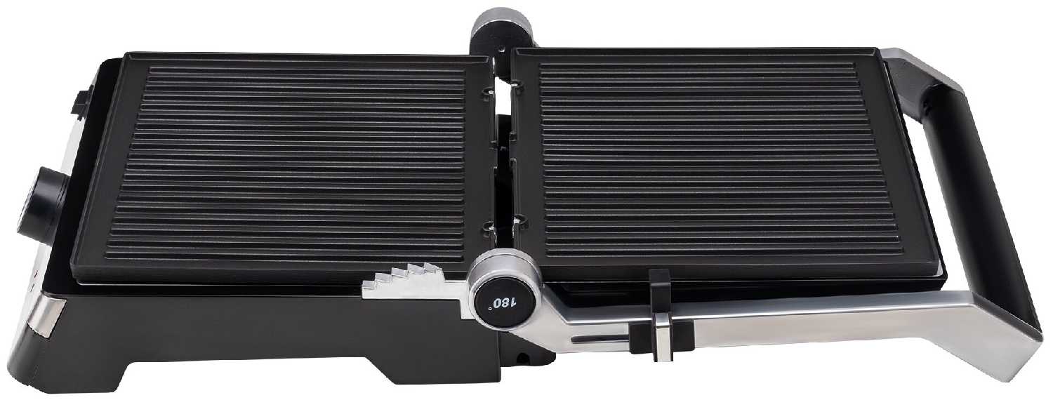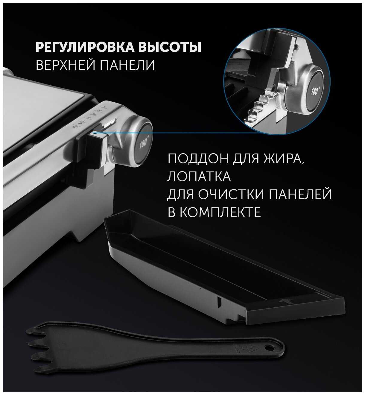 - + лаконичный дизайн, качественная сборка, материалы корпуса, пластик и алюминий(, раскладной на 180 градусов. фиксатор положения верхней крышки. гарантия от производителя 3 года. собирается просто. встроенный лоток для жира.очень удобно,нигде не выпирает. удобная кнопка раскалывания гриля.