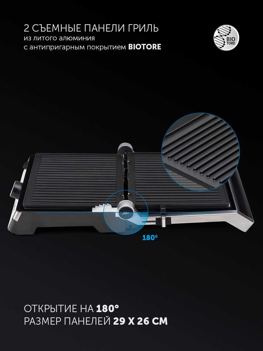 | Дополнительная информация : | размер съемной гриль-панели 25 х 29 см, материал рабочей поверхности: алюминий, длина шнура: 106 м, комплектация: гриль 2 съемные панели с антипригарным покрытием BIOTORE поддон для жира лопатка для очистки панелейгарантийный талон инструкция |