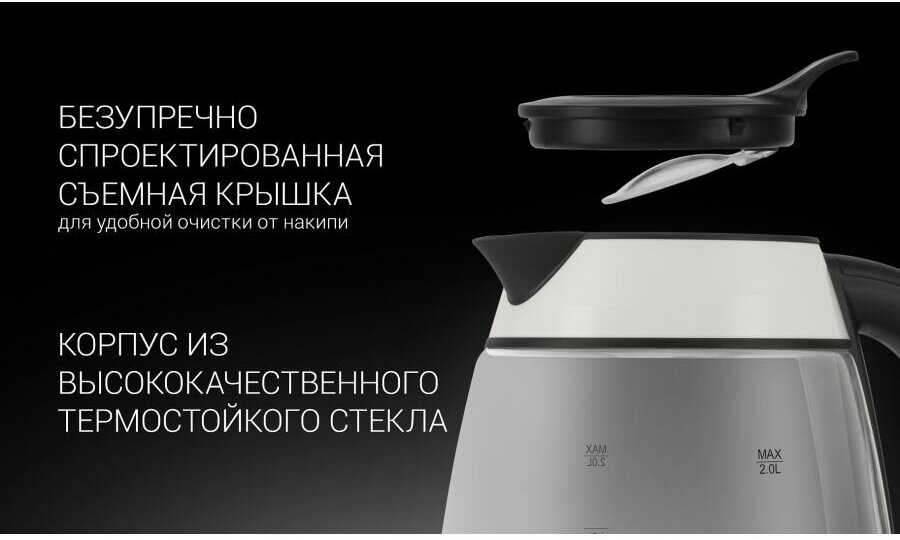 - Автоматическое отключение после закипания и при снятии с подставки обеспечивает безопасность и экономию энергии.