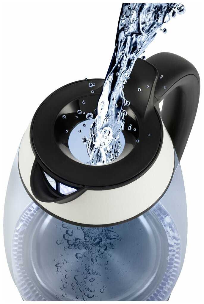 Прозрачный стеклянный корпус позволяет легко контролировать уровень воды, с маркировкой в литрах и чашках на обеих сторонах. Это удобно для пожилых или тех, кто экономит энергию, наливая ровно столько, сколько нужно. После кипячения стенки запотевают, но взбалтывание быстро возвращает прозрачность. Некоторые отмечают трудности в распознавании границы из-за конденсата. Функция упрощает использование по сравнению с непрозрачными моделями. -