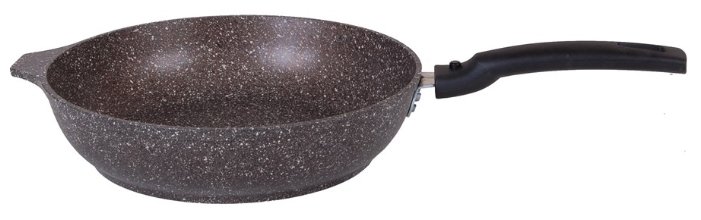 Сковорода изготовлена из литого алюминия с трехслойным антипригарным покрытием PFOA-free. Ручка выполнена из термостойкого бакелита с мягким покрытием Soft Touch, которое не скользит в руке.