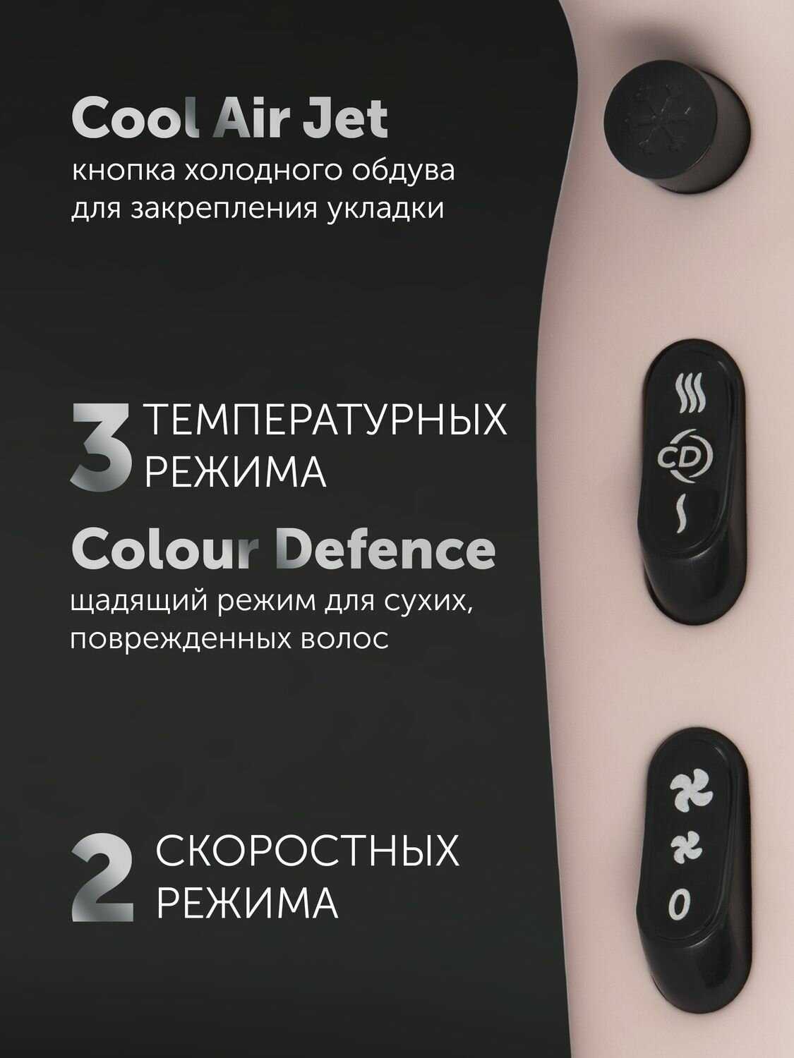 - 3 температурных режима (холодный, теплый, горячий) и 2 скорости позволяют адаптировать сушку под тип волос, минимизируя перегрев.