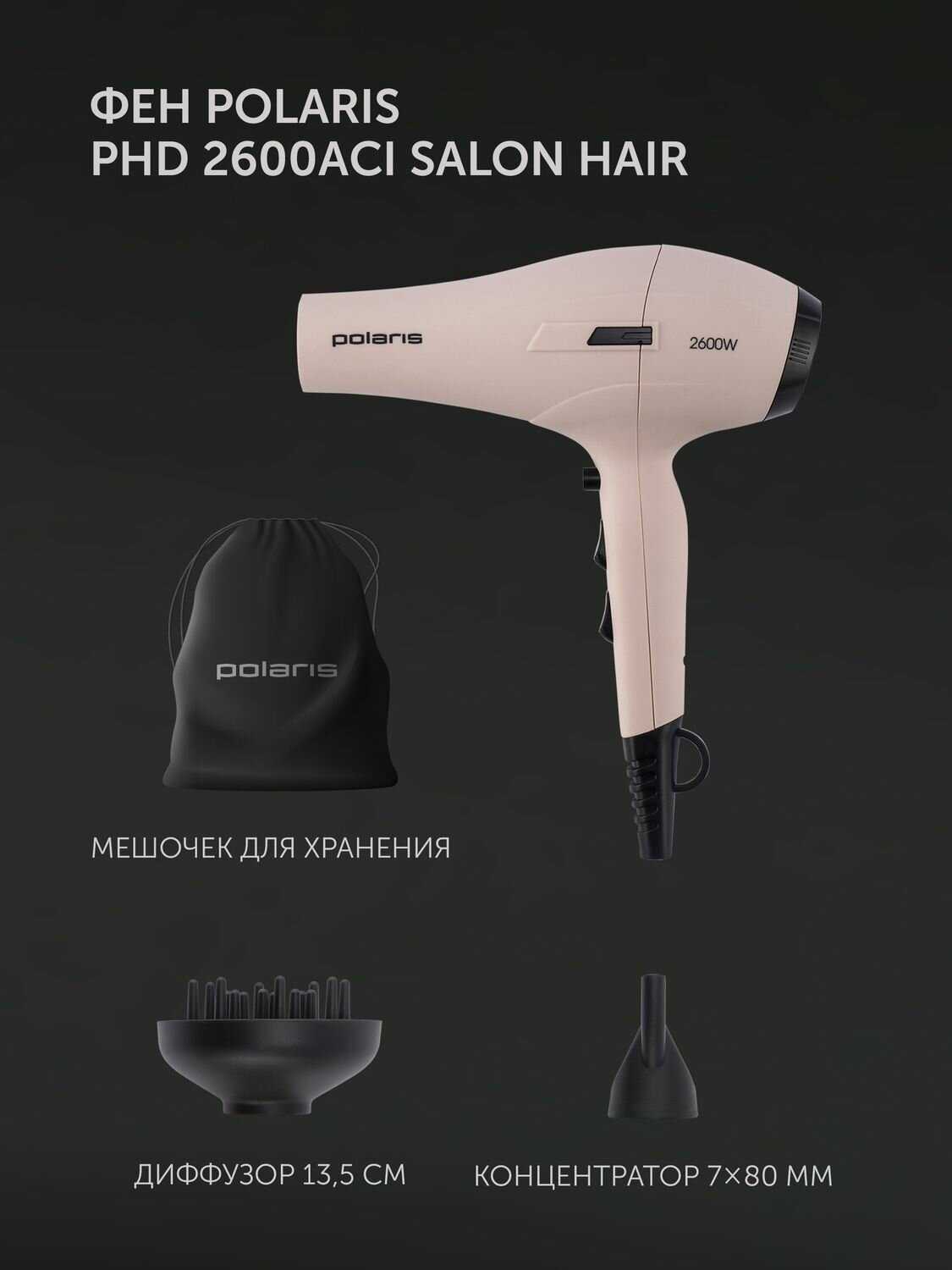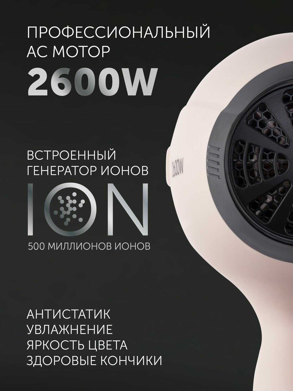 - Мощность 2200–2300 Вт обеспечивает быструю сушку даже густых волос (5–7 минут для средней длины).