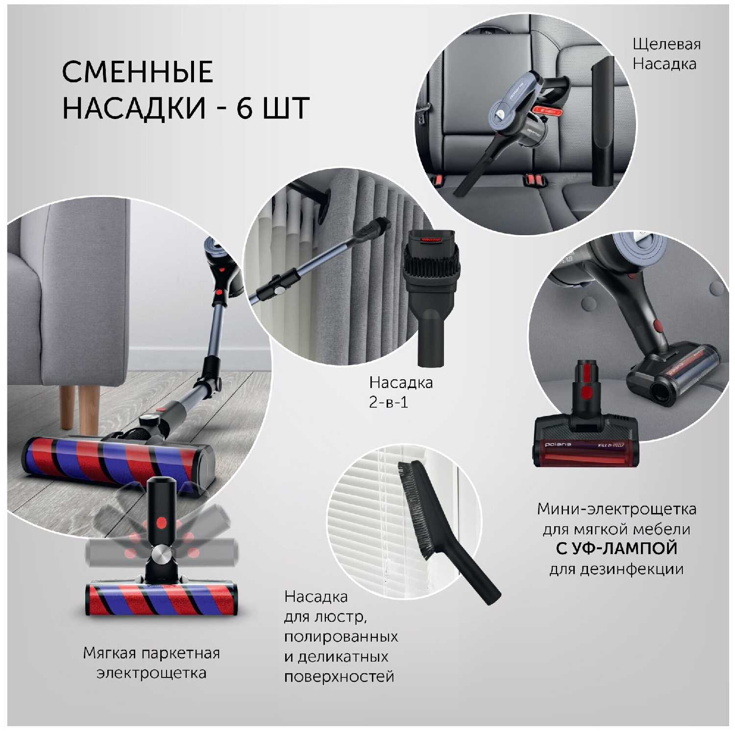 В комплекте 6 насадок: турбо-щетка для ковров, основная электрощетка для пола, щелевая для узких пространств, мини-щетка для мебели, насадка для влажной уборки и УФ-насадка для дезинфекции. Дополнительно есть насадка для деликатных поверхностей (например, люстр). Пользователи особенно хвалят щелевую и УФ-насадки за их универсальность.