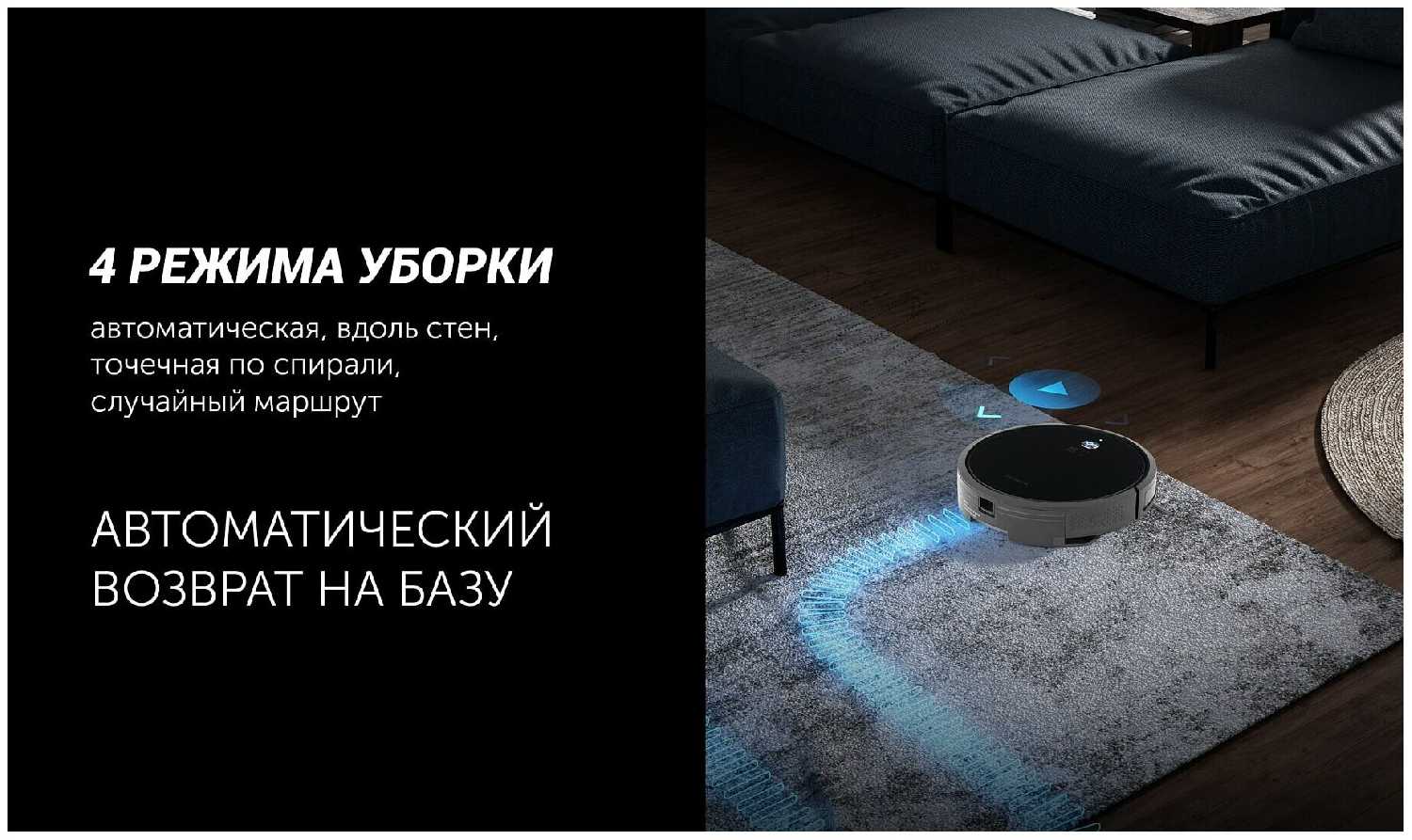 - Подключение по Wi-Fi позволяет запускать уборку удаленно, настраивать расписание (включая разные дни недели) и выбирать режимы (периметр, спираль, смарт).