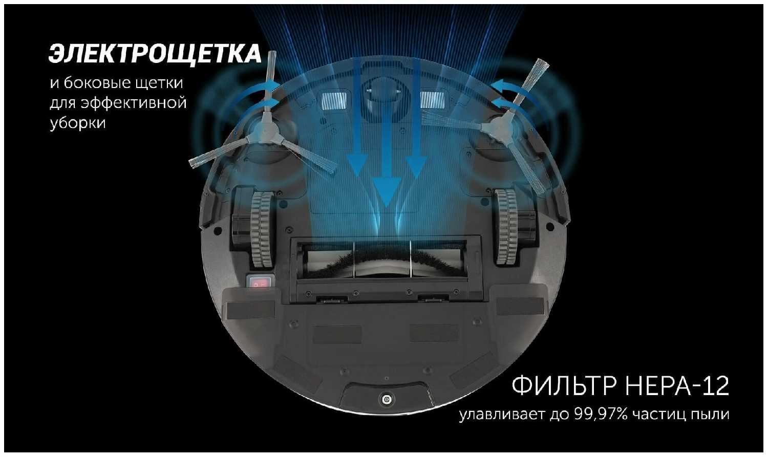 - Робот оснащен двумя режимами работы: стандартным (тихим) и интенсивным (до 25 Вт), что позволяет адаптироваться к разным типам загрязнений.