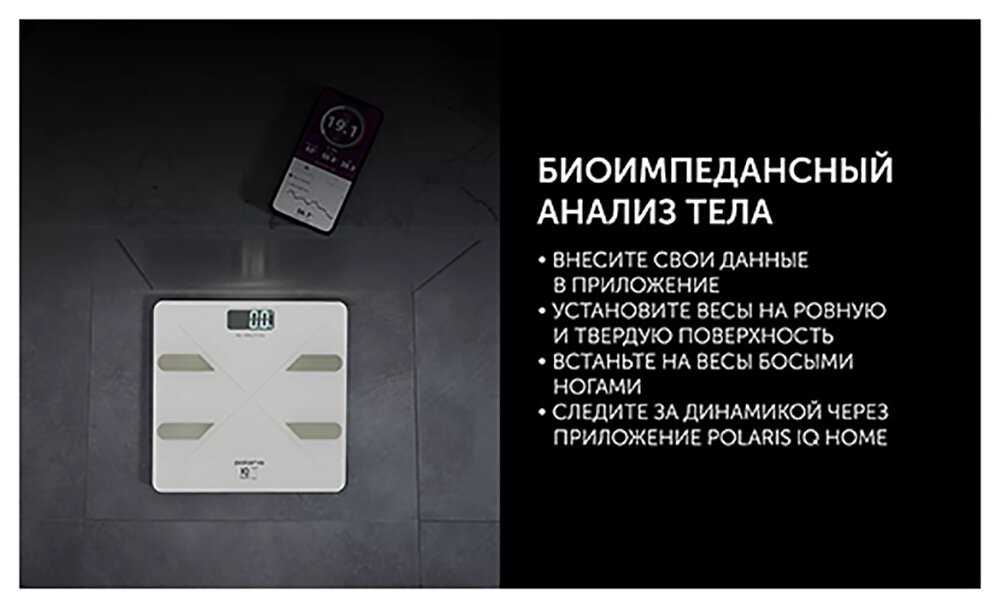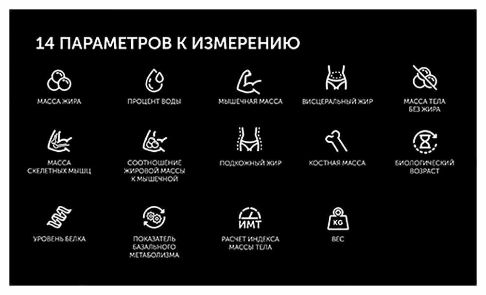 - Данные о 14 параметрах тела (жир, мышцы, вода, костная масса, ИМТ) передаются в приложение мгновенно.