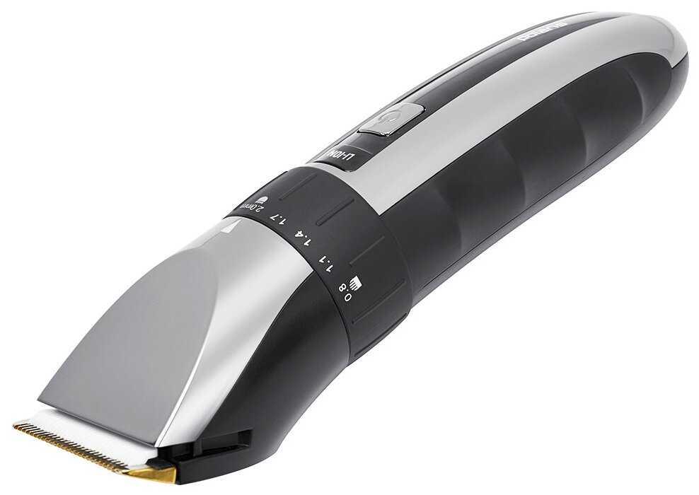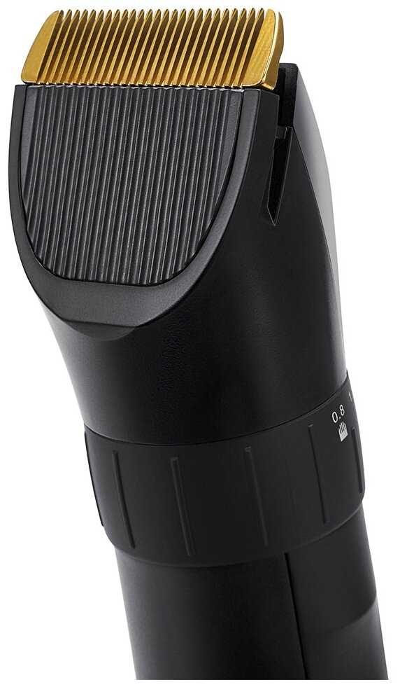 - Комбинированные лезвия из керамики и титана обеспечивают точный и гладкий срез без зажевывания волос.