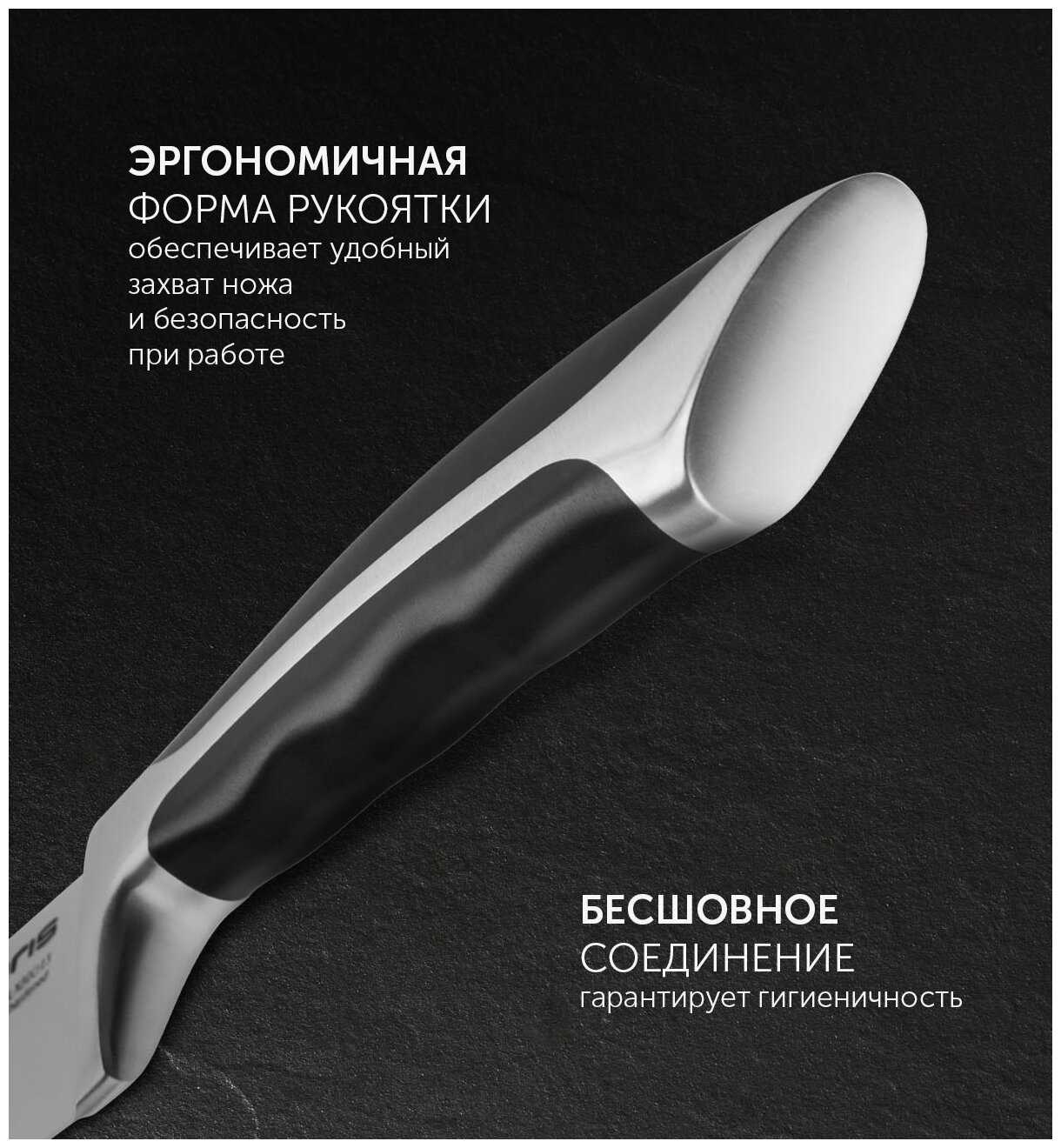 Двусторонняя заточка и оптимальный угол режущей кромки обеспечивают чистый рез без "разлохмачивания" волокон мяса или крошения хлеба. При работе с рыбой лезвие гладко отделяет филе от костей, а при шинковке капусты – дает ровные, неповрежденные слои. Толщина полотна предотвращает вибрацию. -