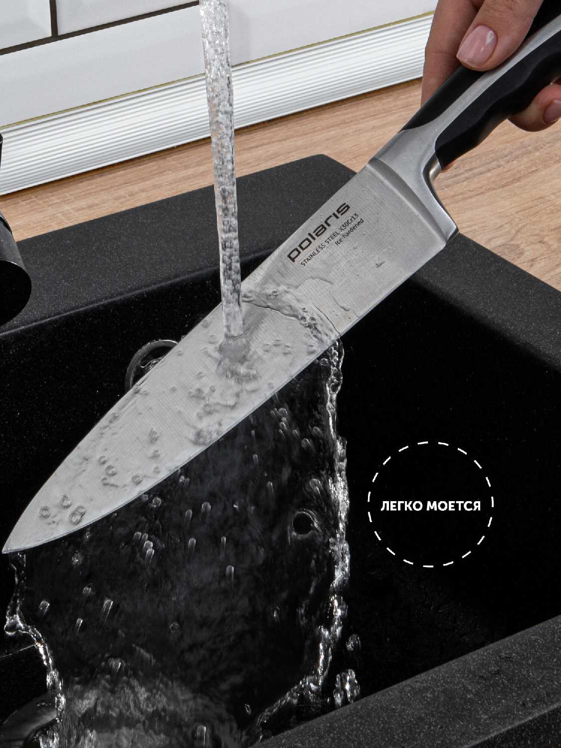 - Монолитная конструкция позволяет мыть ножи агрессивными средствами без риска повреждения соединений.
