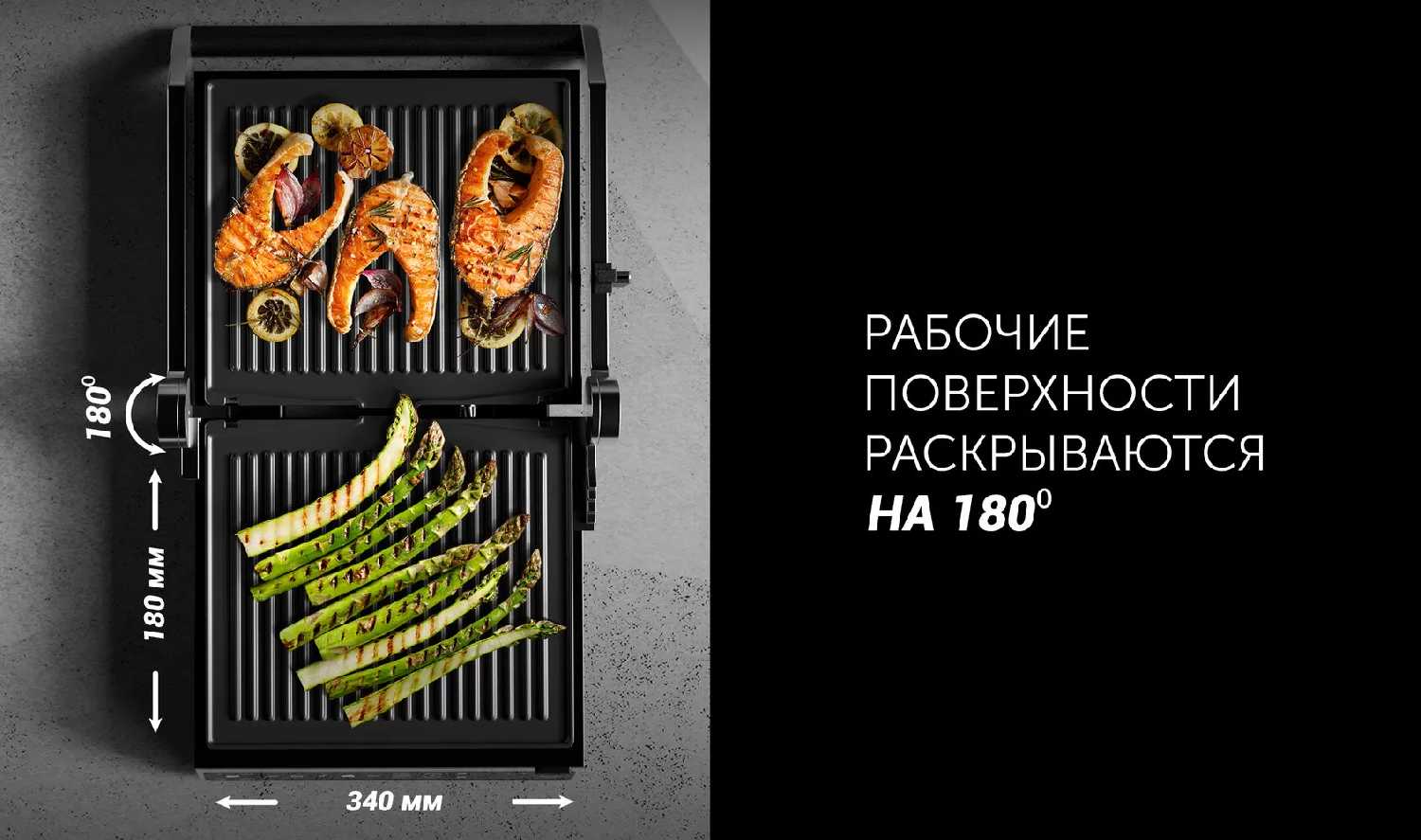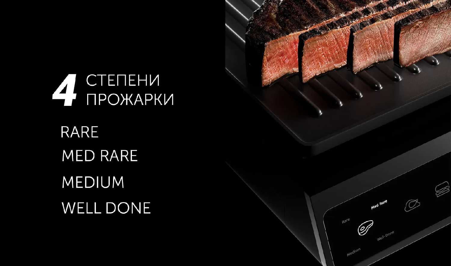 - Двойной нагрев «запечатывает» соки в мясе (стейки готовятся за 5–10 минут без пересушивания).