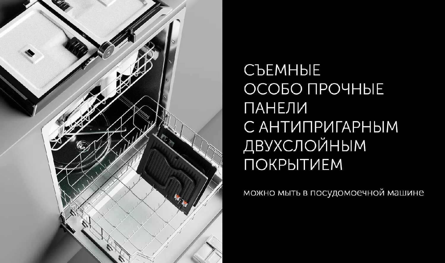 Съемные панели моются в посудомойке, очень удобно. Покрытие такое, что ничего не прилипает, легко отмывается.