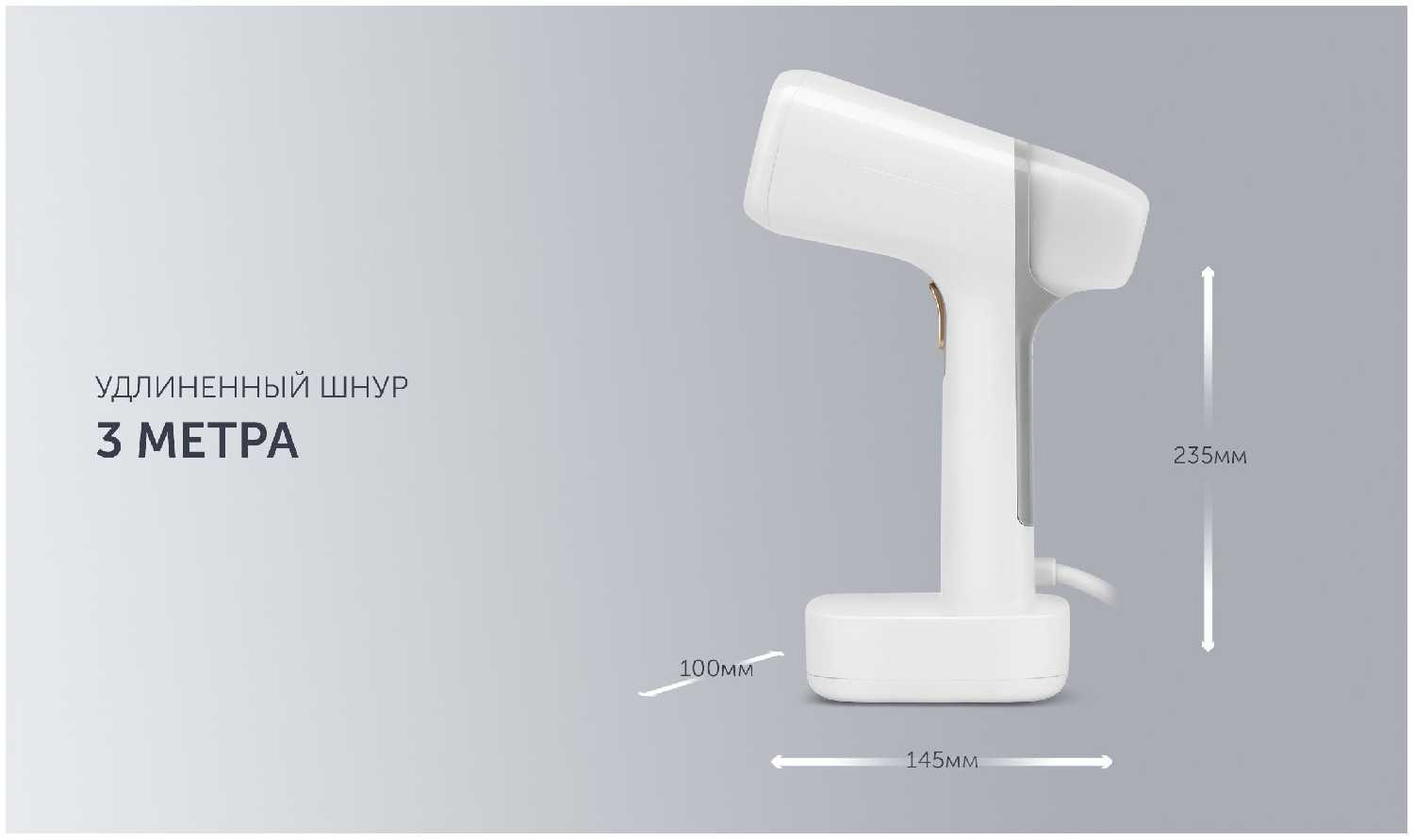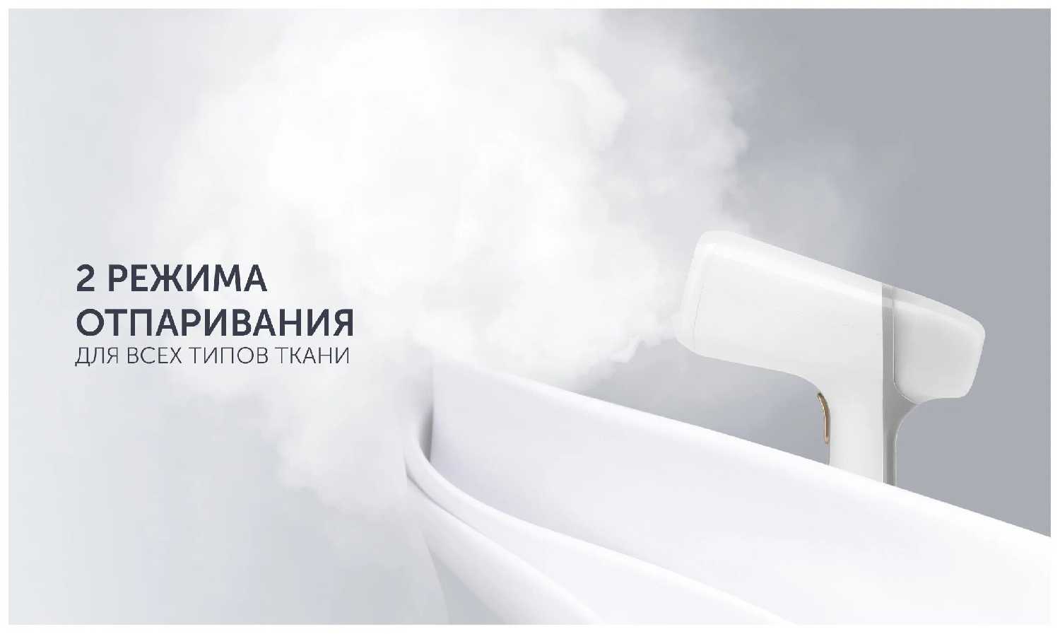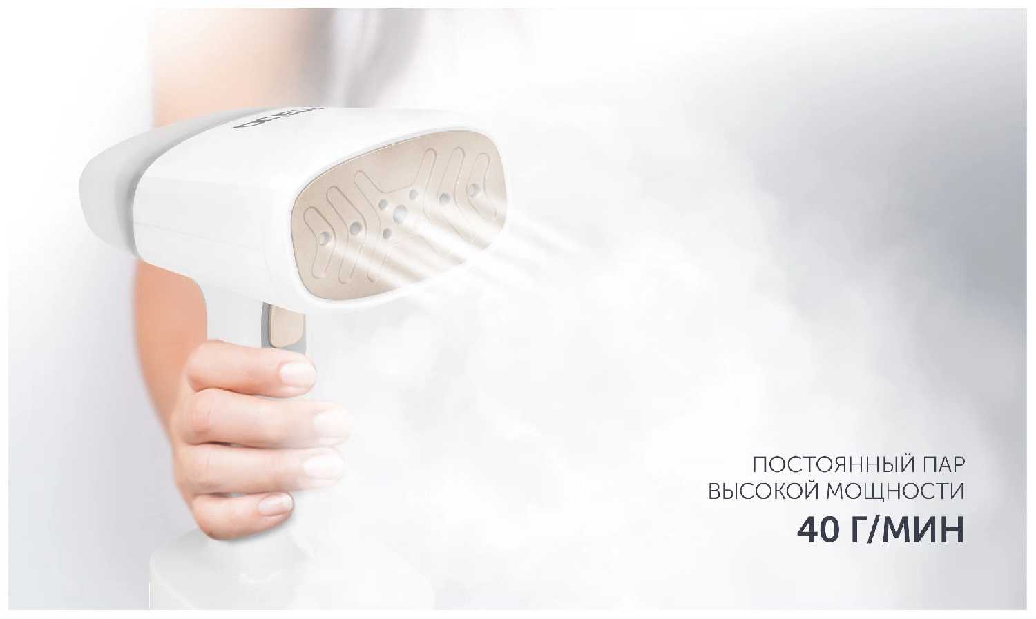 - Терморегулятор поддерживает температуру пара 140-150°C, оптимальную для большинства тканей.
