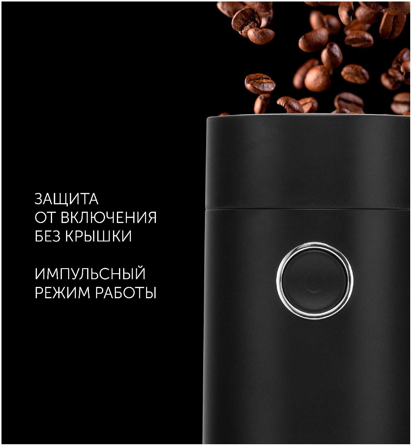 - + Простота управления: одна кнопка включения-выключения позволяет легко регулировать степень помола вручную.