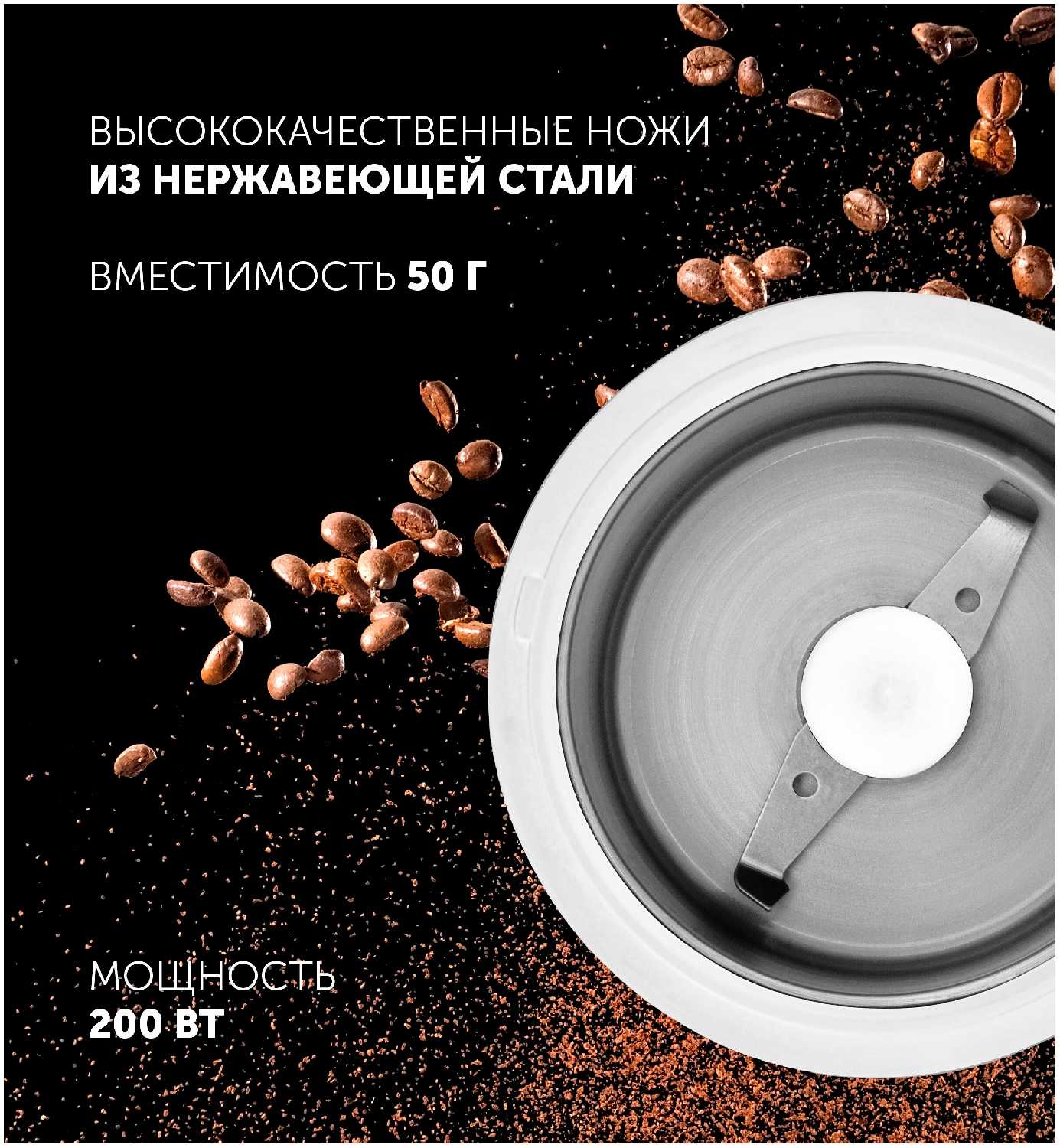 - Ножи эффективно справляются с кофейными зёрнами, орехами и специями, обеспечивая мелкий или средний помол в зависимости от времени работы.