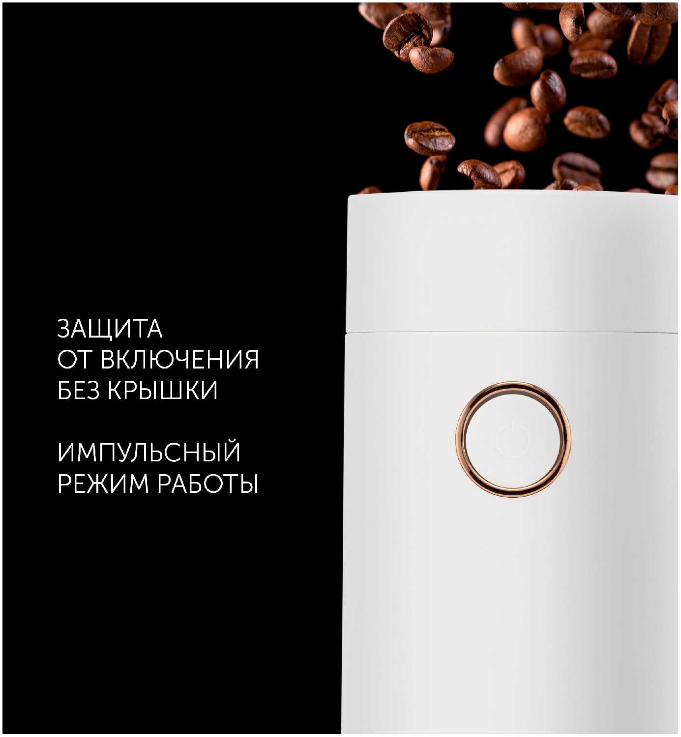 - + Простота управления: одна кнопка включения-выключения позволяет легко регулировать степень помола вручную.