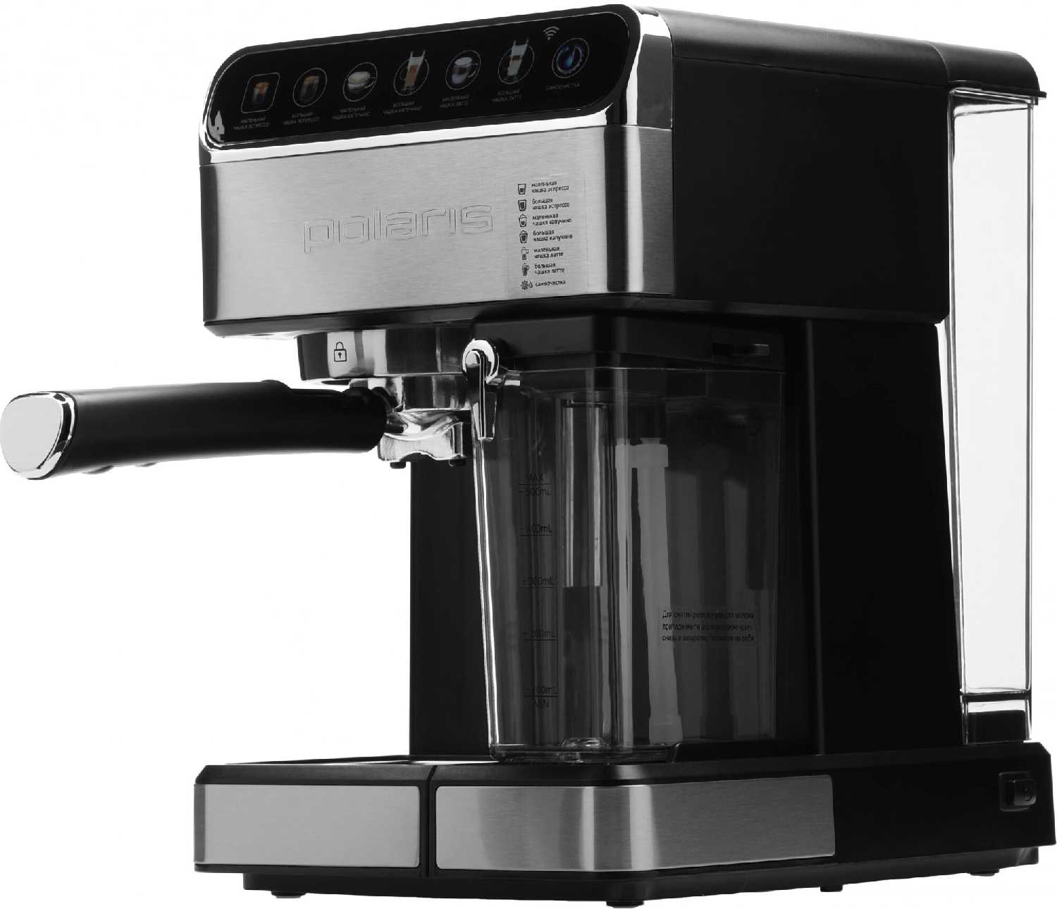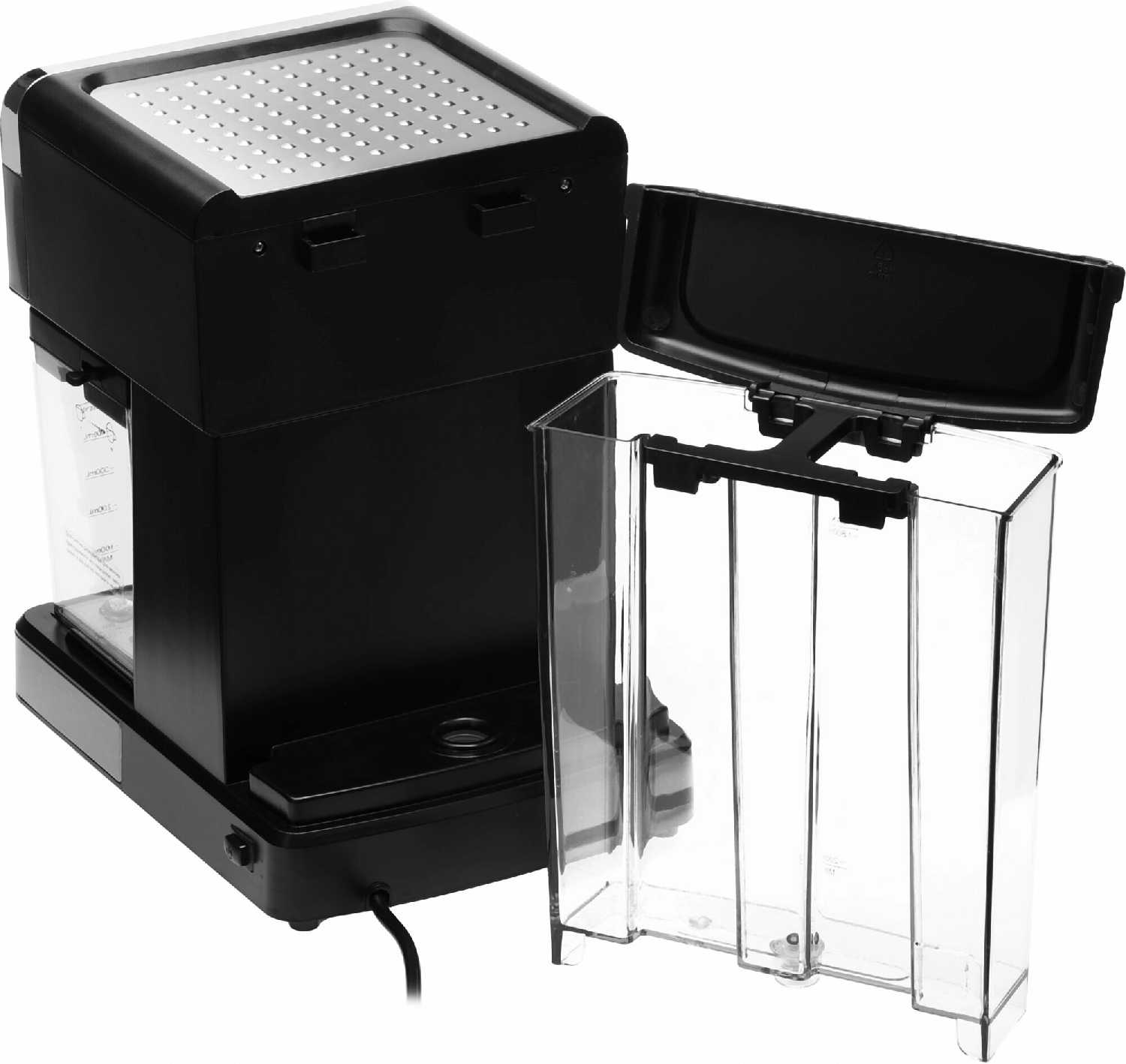 Большая емкость для воды (1.8л) и для молока (0,5л), компактный размер, привлекательный дизайн, можно использовать для приготовления капсулы и молотый кофе