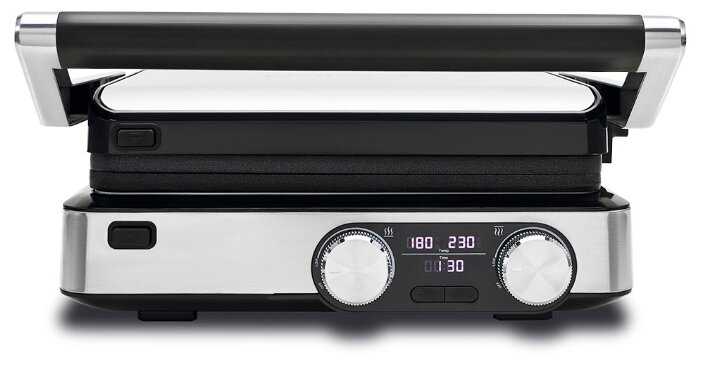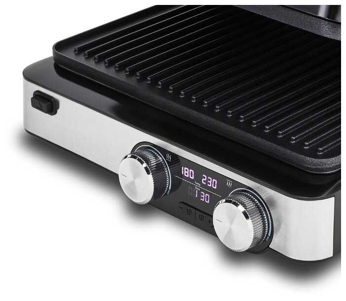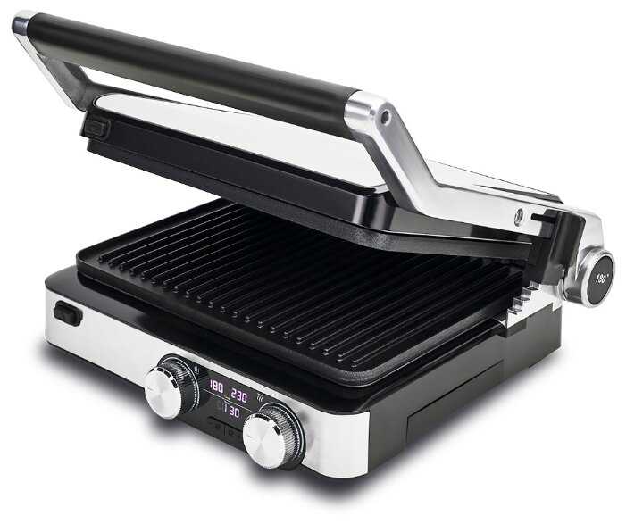 В своём ценовом сегменте отличный гриль, съёмные нагревательные панели, возможность регулировки температуры каждой панели отдельно,раскрывается на 180 градусов,наличие таймера, нагрев до 230 градусов, удобная ручка, внешний вид