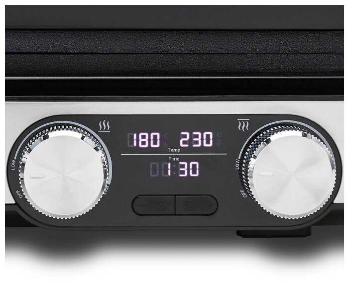 - + Удобная ручка, чтоб закрывать или открывать гриль, два регулятора темпы - левый для нижней, правый для верхней идет. Небольшой дисплей есть, там же внизу кнопки для установки таймера.