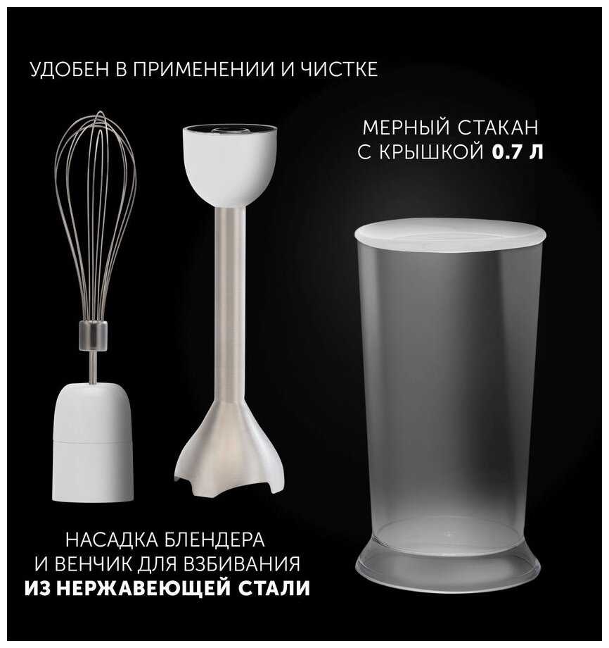- В комплекте: мерный стакан с герметичной крышкой (1 л), чаша-измельчитель (0.6 л) с резиновыми ножками, венчик для взбивания.