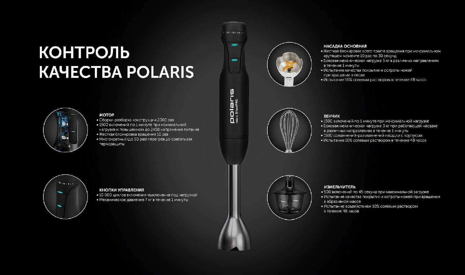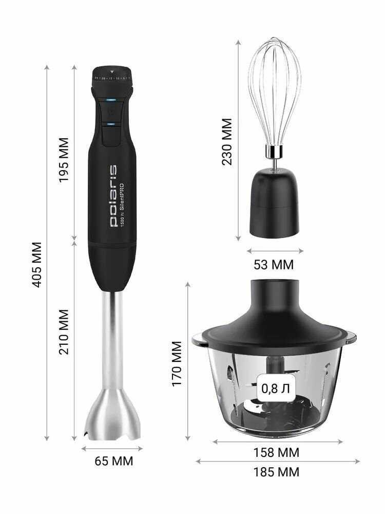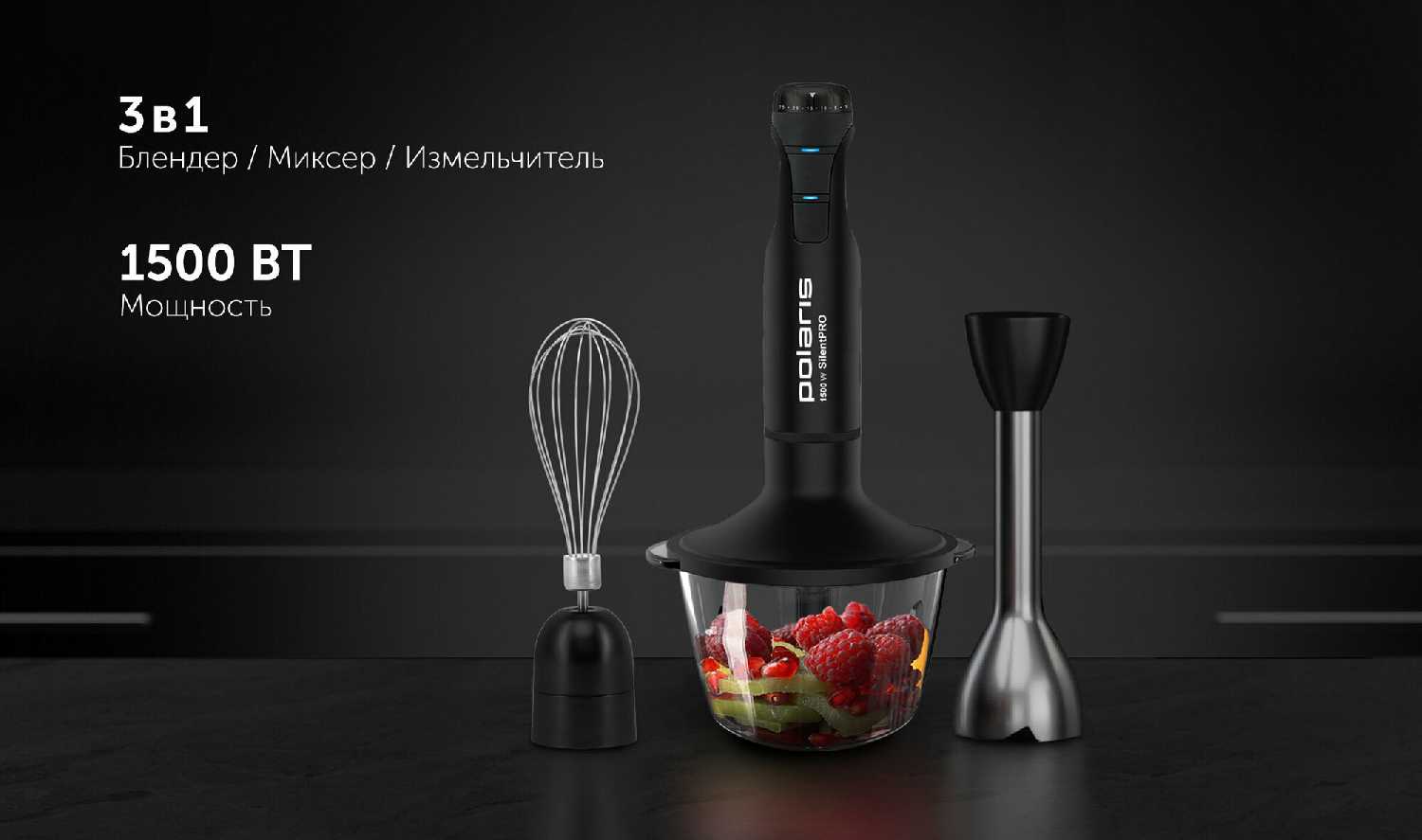 - + Достойный блендер, миксер, измельчитель — универсальный погружной блендер 3 в 1 от фирмы Polaris, смотрится качественно и дорого! В полной комплектации. Ручка корпуса слегка прорезиненная, приятная на ощупь и удобная в руке. Плавное переключение 25 скоростей и отдельно турбо-режим. Мощности блендера достаточно, 1500 ватт, не шумный, производитель обещает двойную защиту двигателя от перегрева и перегрузки. Соединения с насадками четкие в повороте. Блендерная насадка и венчик для взбивания из нержавеющей стали. Ножи блендера с титановым покрытием. При выборе данного блендера отметил большим плюсом стеклянную чашу измельчителя объемом 800 мл. Снаружи на дне чаши присутствует нескользящая резиновая прокладка, а внутри стеклянной чаши ставятся и снимаются 4 острых ножа также из нержавеющей стали, двухуровневым расположением обеспечивает эффективное измельчение продуктов. Еще присутствует мерный стакан из небьющегося пластика объемом 700 мл, порадовала крышка стакана с защитой от брызг))