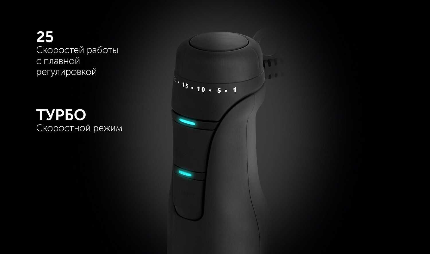 Блендер имеет плавную регулировку скоростей, их количество составляет 25, а также отдельную кнопку турбо-режима для максимальной мощности. Пользователи отмечают, что переключать скорости можно прямо во время работы, не останавливая прибор. Управление интуитивно понятное, кнопки расположены удобно, что делает процесс приготовления комфортным. -