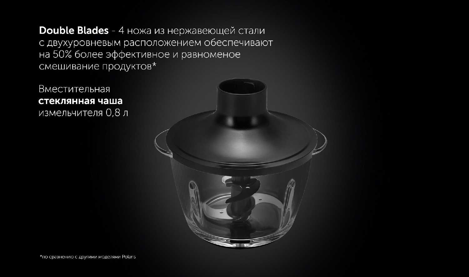 - Двухуровневые титановые ножи (4 лезвия) обеспечивают равномерное измельчение.