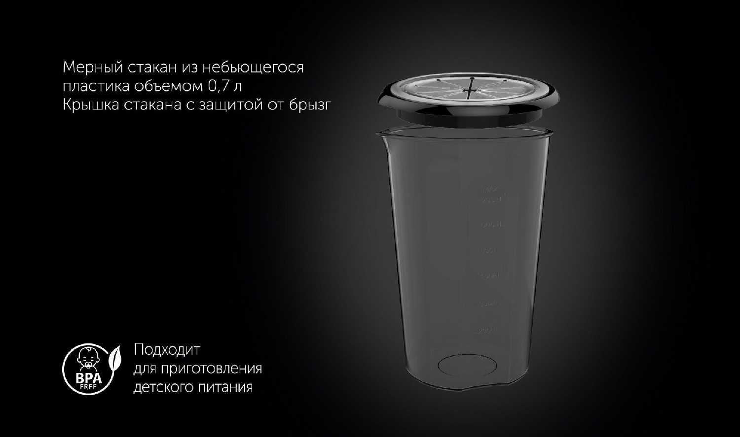 Мерный стакан объемом 0,7 литра изготовлен из прочного, небьющегося пластика. Крышка с защитой от брызг, которая идет в комплекте, считается очень полезным аксессуаром. Она надевается на стакан во время взбивания или смешивания, что позволяет содержать кухню в чистоте. Пользователи отмечают, что это особенно удобно при приготовлении коктейлей, соусов и теста. -