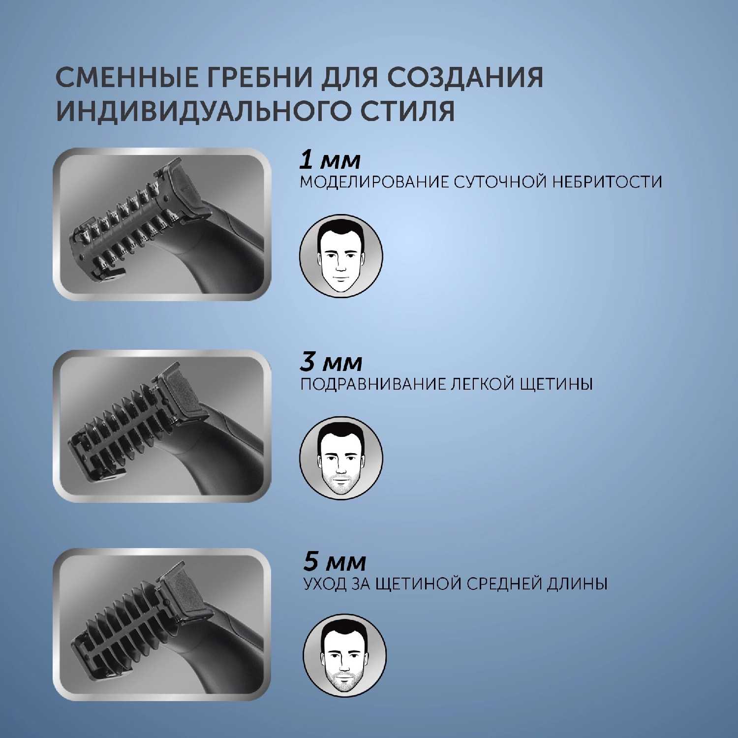 - регулировка длины стрижки: смена насадок