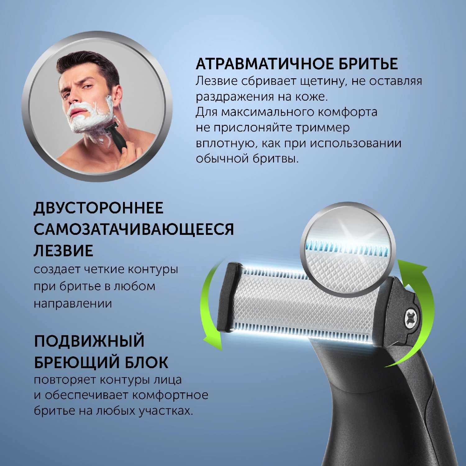 - + Лезвия двойные, самозаточка есть, по контурам плавно ходит + ддя хранения и ухода приспособы