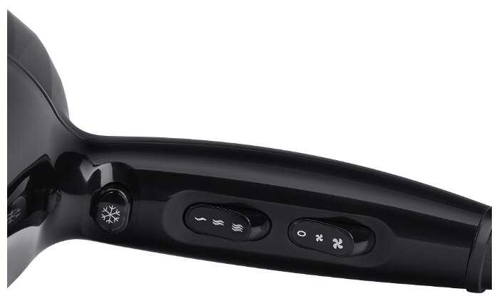- Две скорости подачи воздуха позволяют выбрать интенсивность: средняя для деликатной сушки, максимальная — для экспресс-укладки.