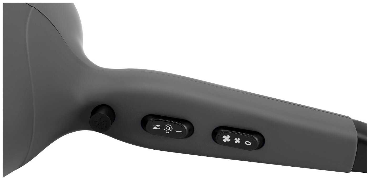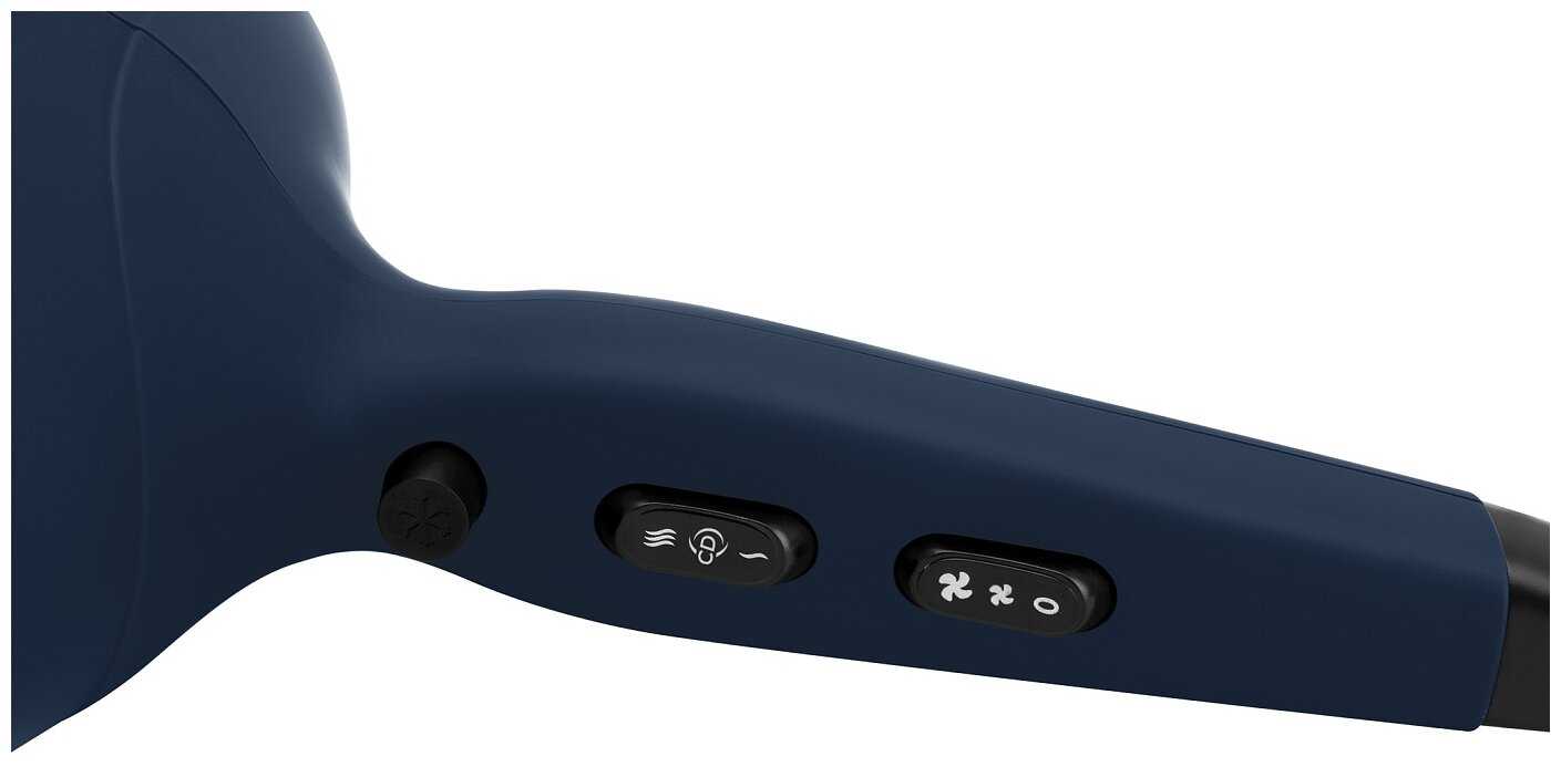 Фен имеет раздельные регуляторы: 3 температуры (холодный/теплый/горячий) и 2 скорости потока. Кнопки качественные, без залипания, но расположены на рукоятке – некоторые пользователи случайно задевают их при смене хвата. Холодный обдув активируется отдельной кнопкой, которую нужно удерживать пальцем. -