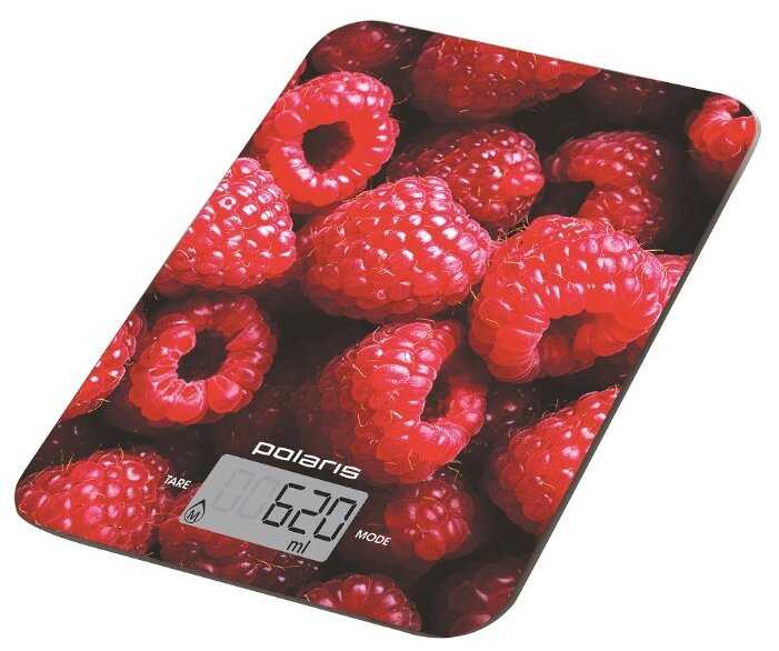 - Весы имеют симпатичный внешний вид с ярким рисунком (например, малина), который гармонично вписывается в кухонный интерьер и украшает стол.
