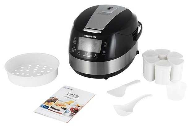 - В набор входят мерный стакан, лопатки, ёмкость для варки на пару и 6 стаканчиков для йогурта.