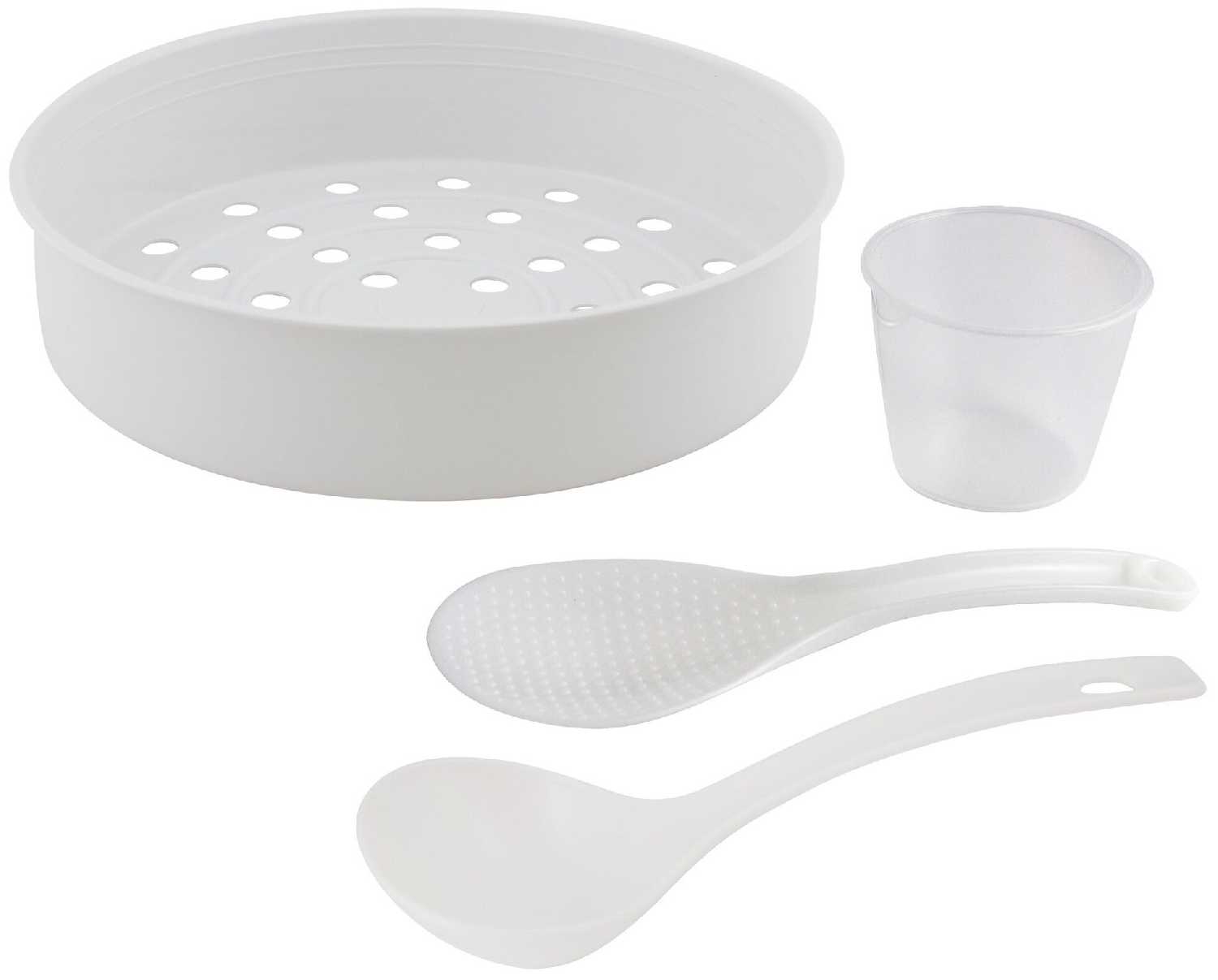 - В набор входят мерный стакан (объёмом 180 мл), две силиконовые лопатки и контейнер для пароварки с перфорированным дном.