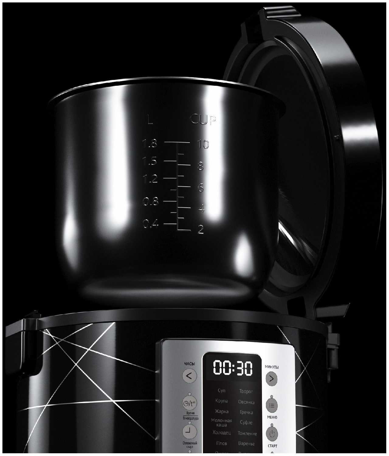 Умная мультиварка со множеством автоматических программ и возможностью управления с телефона. Стильный дизайн. Имеется руководство по эксплуатации и книга рецептов. Готовлю плов. Плов получается отменный, ничего не пригорает. Я довольна покупкой, от души рекомендую.