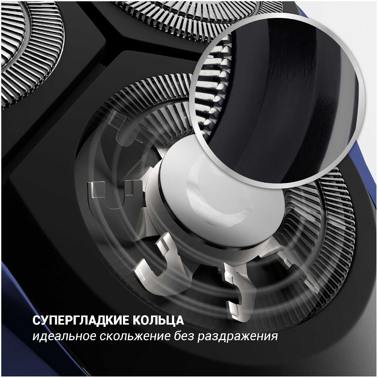 - Плавающие бритвенные головки с вращением на 360° обеспечивают плотное прилегание к контурам лица, включая сложные зоны (шея, подбородок).