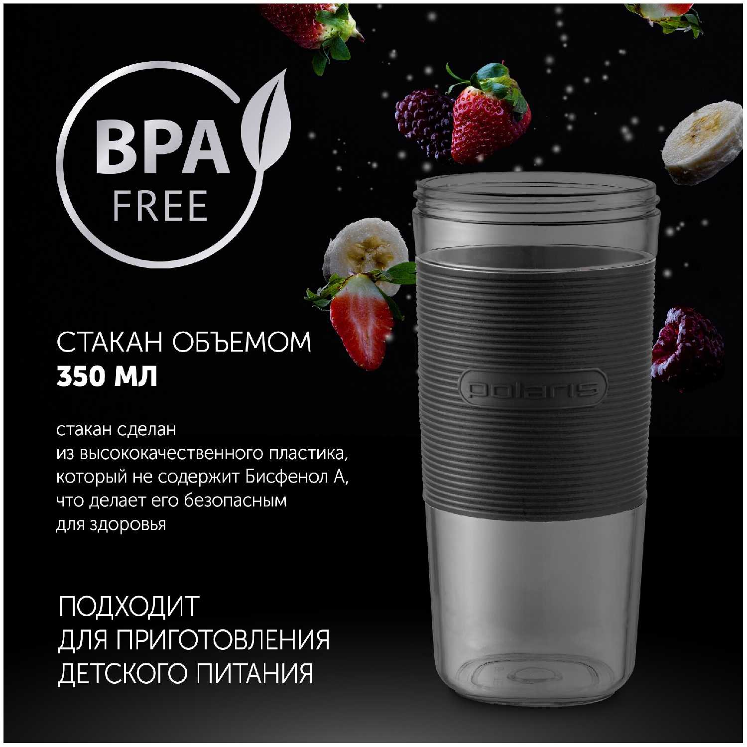 - Стакан из пищевого пластика (без BPA) не впитывает запахи и подходит для холодных/горячих ингредиентов (до +80°C).